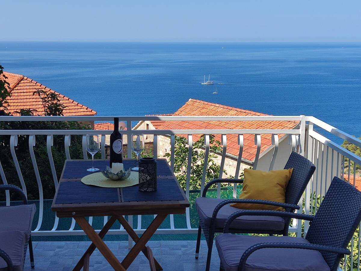 El apartamento de 60 m 2 consta de un dormitorio con una gran cama doble, un baño, una amplia sala de estar con una cocina, una antesala y un balcón. Toda la pared sur del mar está en vidrio, por lo que el espacio tiene mucha luz y con un balcón constituye un espacio. El departamento está ubicado en el tercer piso de la casa, que se encuentra cerca del centro de la ciudad (5 minutos a pie a lo largo del mar) y desde el balcón tiene una vista abierta del mar y de las islas, ya que la casa se encuentra en la primera fila junto al mar.