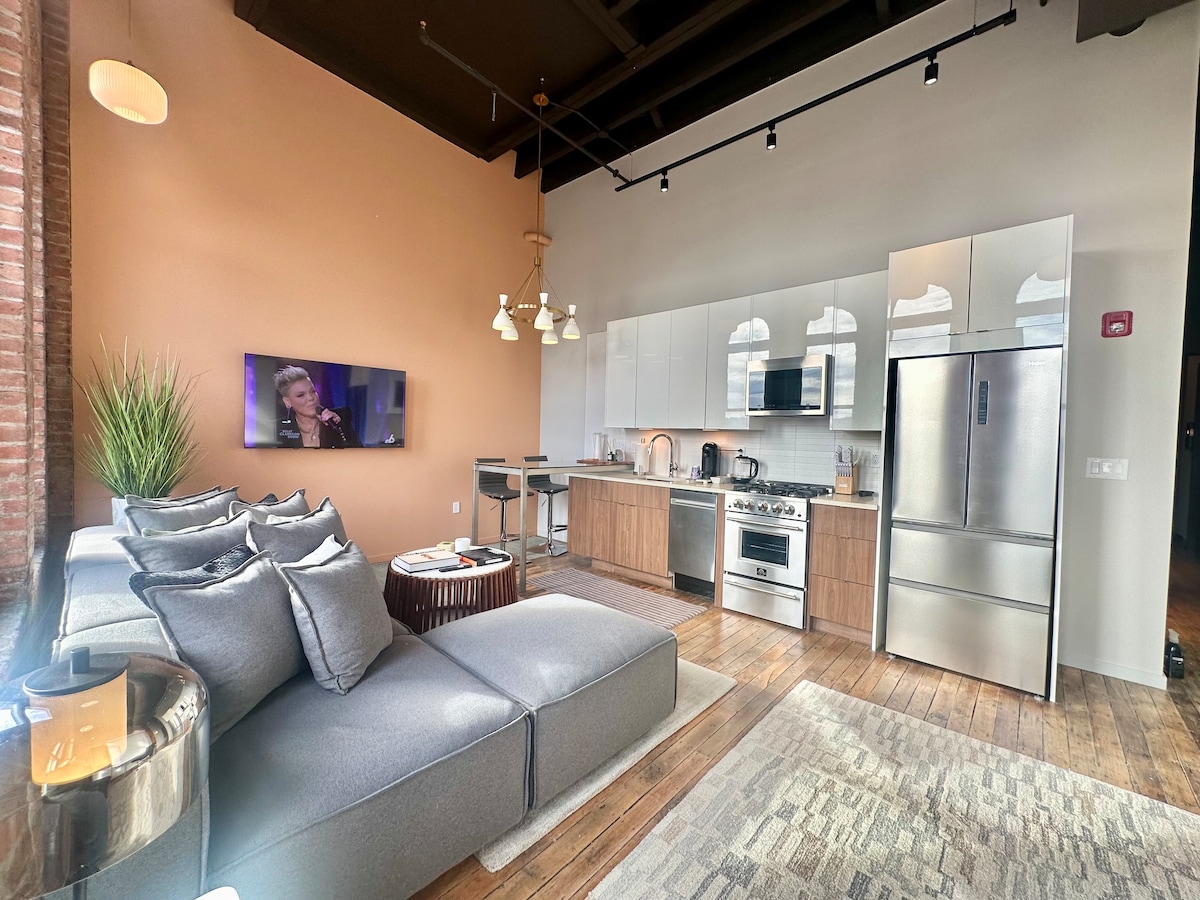 Loft de diseño de ladrillo y vigas de 1 dormitorio, lo mejor de Armory Square