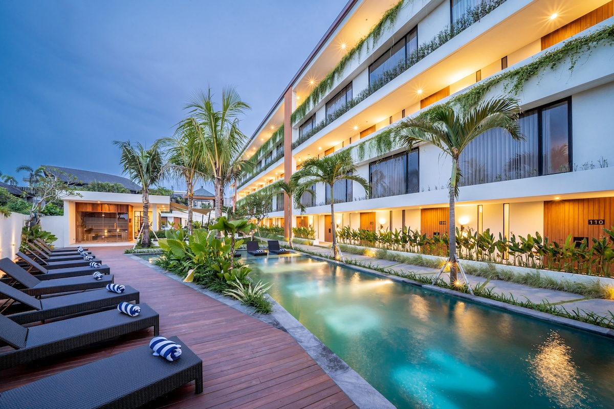 Ubicados en el vibrante barrio de Canggu, los apartamentos Deluxe te sitúan en el epicentro del encantador estilo de vida de Bali, desde sus impresionantes playas hasta su rico tapiz cultural. Elige nuestros apartamentos Deluxe para disfrutar de una estancia que define la vida de lujo, donde cada detalle está cuidadosamente pensado para que tu aventura en la isla sea aún más encantadora. Adéntrate en el reino del lujo sereno en nuestros apartamentos Deluxe, tu mejor refugio enclavado en el corazón dinámico de Canggu.