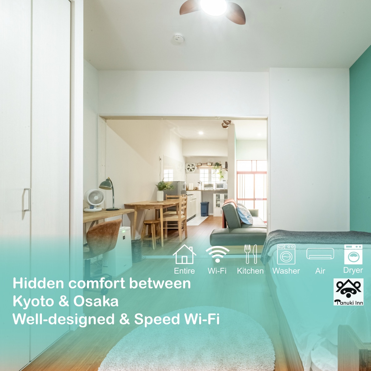 muchos restaurantes gourmet de Osaka. Espacio de 70 ㎡ de uso privado. Casa plana espaciosa y tranquila. Se admiten mascotas. A 3 minutos a pie de la estación de Takii. Acceso directo al castillo de Osaka y Kioto. 〜Conmemoración de nuestra apertura, estamos regalando una bolsa 「kawaii」 con estampado japonés a cada persona.〜 Hay un supermercado, una tienda de comestibles y una calle comercial a poca distancia a pie. A 3 minutos a pie del aparcamiento. Pagaremos la tarifa de estacionamiento, por lo que te daremos un reembolso de 500 yenes al día. ・Cuna · ・Escritorio