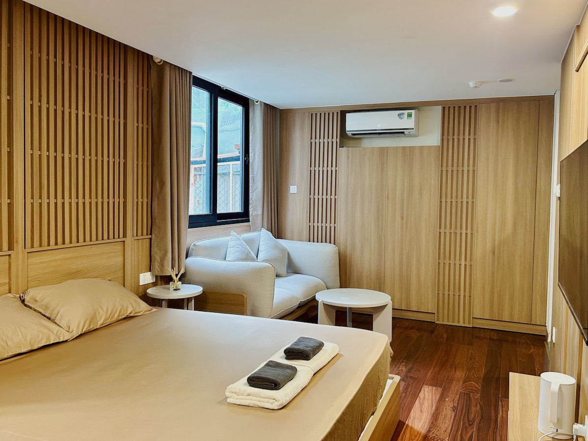 📍 Amplio apartamento de 1 dormitorio con diseño moderno, un balcón con vistas a la ciudad y dos grandes ventanas que dejan entrar abundante luz natural y brisa. Con una ubicación céntrica en Phu Nhuan, una zona segura y vibrante, a solo 100 metros de la calle de comida local, cerca de los restaurantes Phan Xich Long, parque, piscina (con cargo), aeropuerto y mercado Ba Chieu. El traslado gratuito al aeropuerto (auto de 4–7 asientos) está disponible para reservaciones de cinco noches o más.