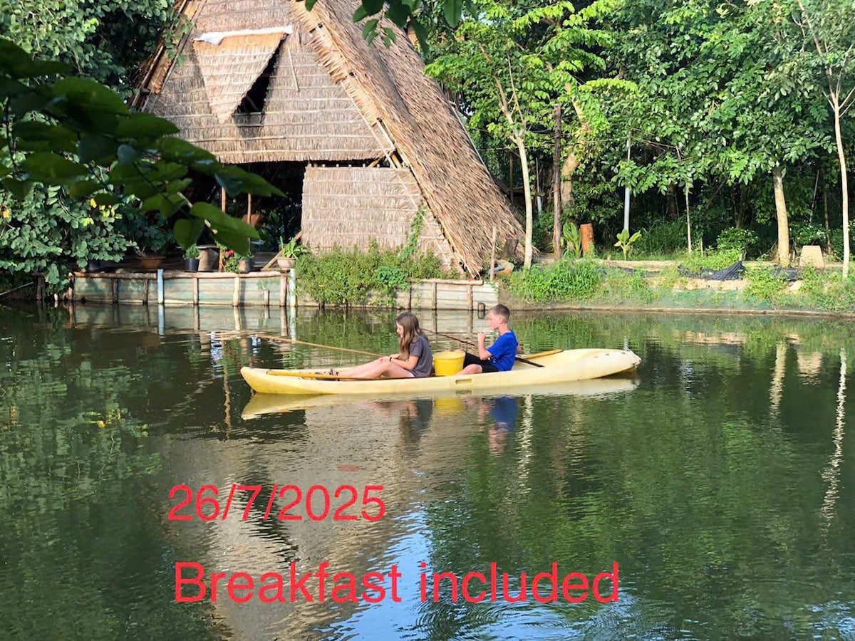 Tucked away on a peaceful branch of the Mekong River, Here Library offers a delightful blend of comfort and adventure. Start your day with the serene river views. Here you can lose yourself in our cozy library that invite you to unwind. Here filled with creative touches from my carpentry workshop, adding a special charm to your stay. Explore nearby market bursting with delicious food, wander through lush fruit gardens and the vibrant rice fields, capture the essence of being here.