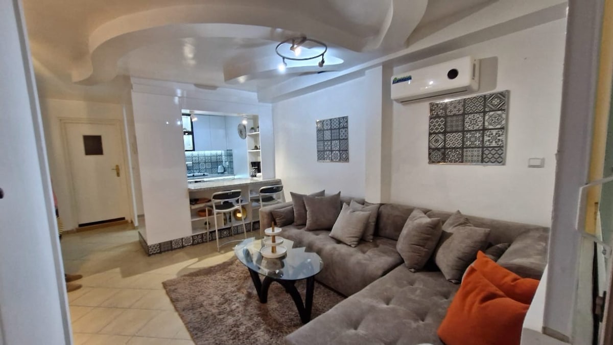 Muy bonito, moderno y acogedor, en una residencia de alto standing en el corazón de Tánger. Tiene un dormitorio con aire acondicionado y televisión de 55" (Netflix, IPTV), una sala de estar muy bien decorada también con aire acondicionado, una cocina muy bien equipada y un bonito baño. El apartamento ofrece todas las comodidades de un hermoso hotel, y está situado en una zona céntrica con todo tipo de comercios Ideal para una estadía turística o profesional