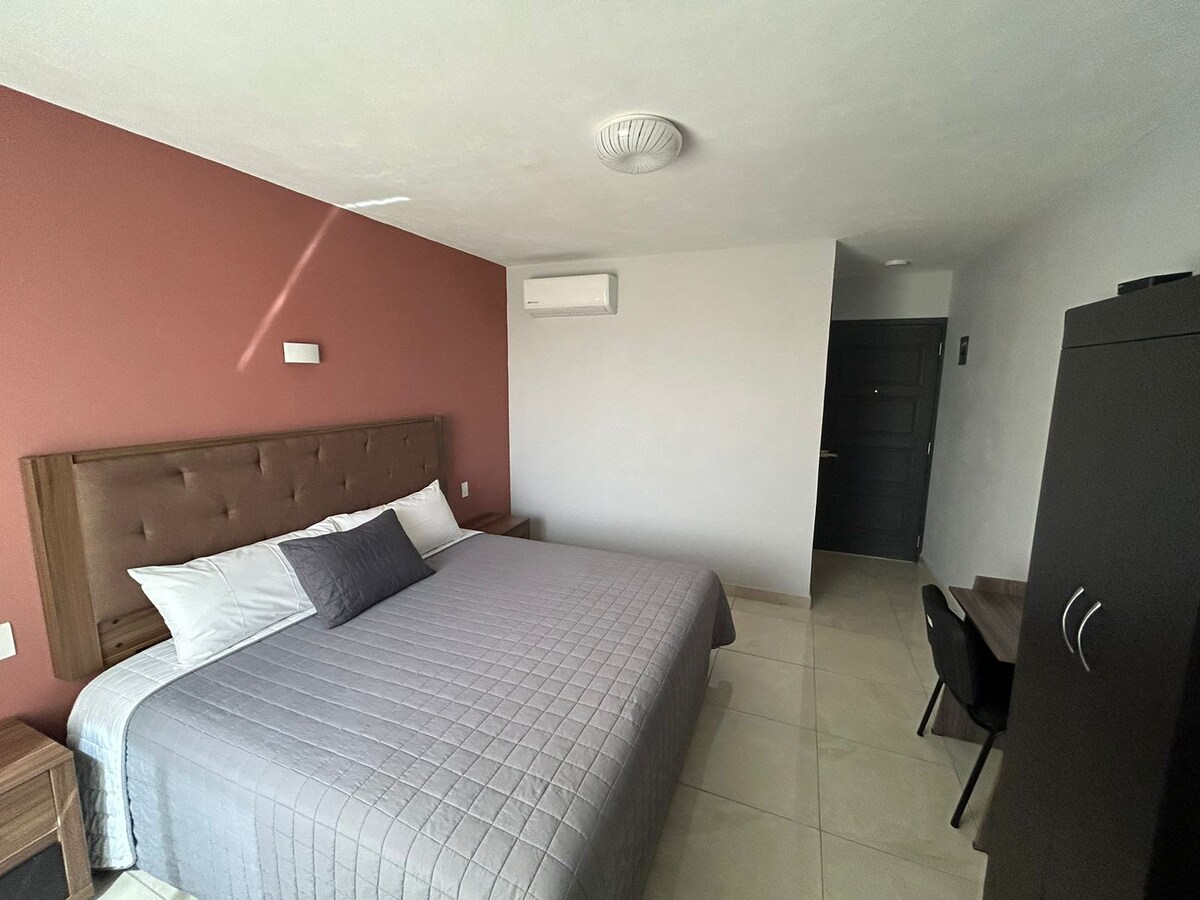 Relájate en este espacio tan tranquilo y elegante. El edificio se encuentra en el corazón de Degollado y encontraras gran variedad en comida y snack por la noche en la plaza principal. Cuenta con cocineta y elementos básicos de cocina, Refrigerador y Estufa de gas. Cama King Size, solicita un colchón individual en caso de ocuparlo. Balcon con vista al Templo y al exterior de la calle.