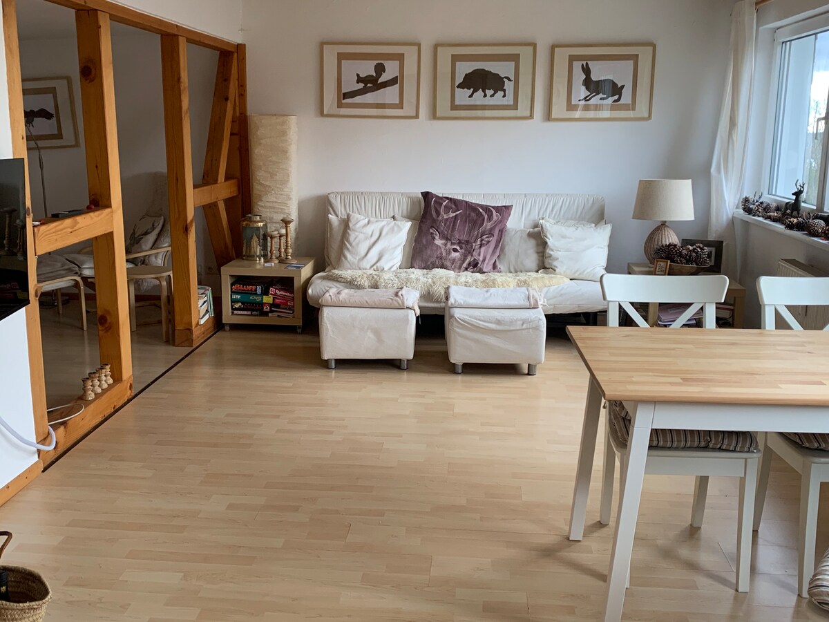 Luminoso apartamento en nuestra antigua casa. El apartamento de la planta baja tiene su propia entrada desde la terraza compartida, donde también se puede hacer barbacoa. El apartamento de 1,5 habitaciones está inundado de luz y en verano está cubierto de vino. Tienes un dormitorio espacioso y una terraza. La cocina totalmente equipada es nueva. El moderno cuarto de baño tiene ducha y bañera. Aquí podrás relajarte después de un día de deporte o leer en la cama.