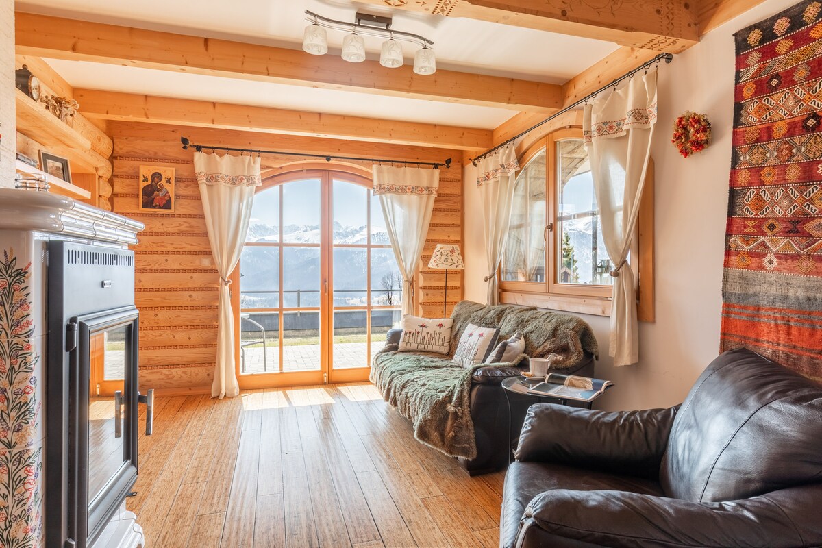 One-level apartment (100 m2) located in a wooden house at an altitude of 1050 above sea level!!! The entrance is separate. The apartment has a large terrace, we provide deckchairs. The view of the mountains "enters" the living room:) You can park your car on the property. The sauna and fireplace are free ,the 2x jacuzzi ( wood hot tub) paid extra. You can reach Gubałówka on foot(1 hour) and go by ropeway to Krupówki (4 minutes). Surroundings: hiking and cycling routes, ski slops!