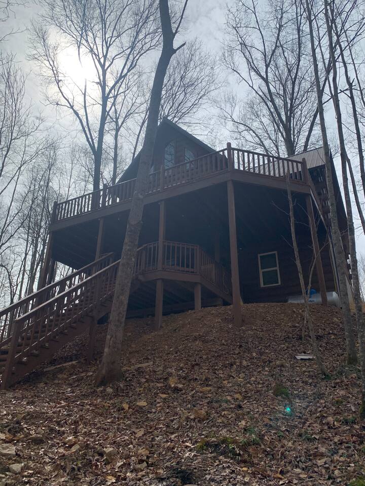 Esta cabaña de estilo Lincoln Log de cuatro dormitorios y tres baños entre las colinas de Lebanon, Kentucky, fue construida en 2006 y se encuentra en 55 acres. Totalmente equipada con vistas panorámicas de 360* y comodidades modernas para un fin de semana relajante... ¡Solo te necesita a ti! ACR es una verdadera escapada de la ciudad. Situada a un cuarto de milla de un camino de grava privado, un terreno aislado y arbolado. Solo tú y la vida silvestre. ¡Adoramos nuestra cabaña y nos encantaría compartirla! Recién remodelada y amueblada con amor y relajación en mente para que la disfrutes.