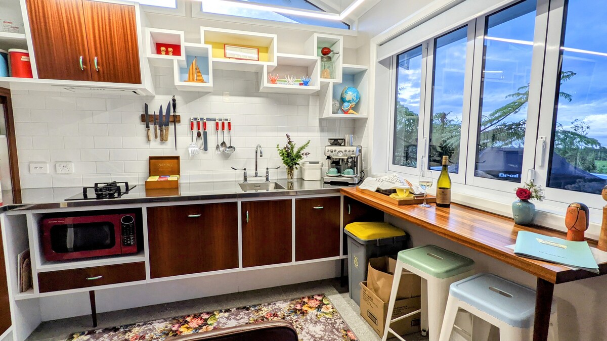 Escápate a la tranquilidad de Kaitake Kabana, un espacio de retiro de estudio fuera de la red, ubicado en las estribaciones de las cordilleras de Kaitake. Este espacio es ideal para dos personas, perfecto para parejas que buscan una escapada (pero puede alojar hasta 4 personas con un colchón adicional en el suelo). El espacio del baño y la cocina pequeña están separados del espacio principal. No hay wifi aquí y la recepción es limitada, ven a abrazar la serenidad y desconectarse del ajetreo de la vida cotidiana.