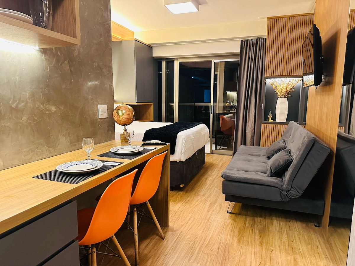 Estúdio funcional (cozinha completa) bem localizado na Liberdade próximo a Av. Paulista e Av. 23 de maio, além de faculdades, hospitais, farmácias, metrô e estacionamentos. Curta essa experiência em um espaço equipado com acomodação para até quatro pessoas, com grande conforto ar quente/frio . Você poderá ainda usufruir de uma bela vista, relaxar na Jacuzzi além de bela área de convivência. O condomínio oferece também coworking, academia e lavanderia.