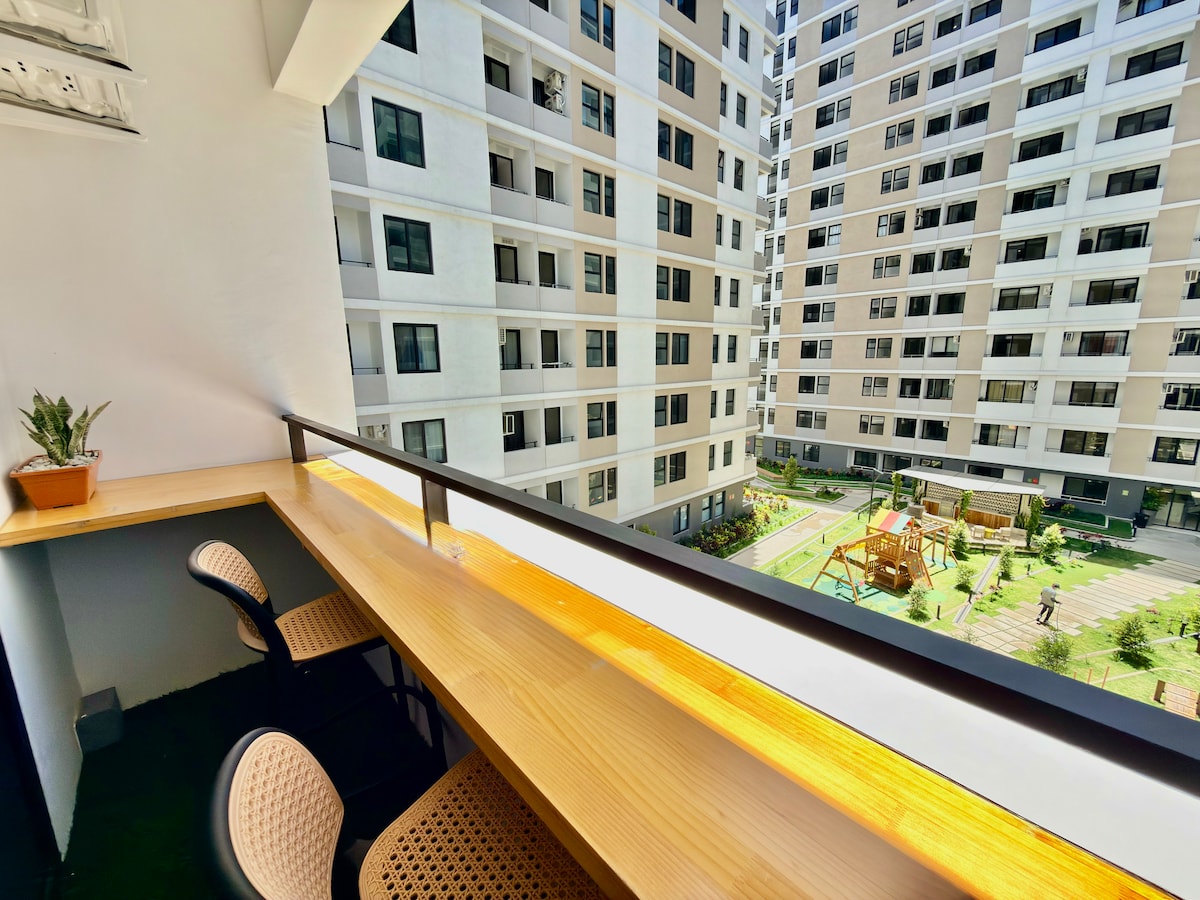 Diseño: • 1 dormitorio + 1 baño • Cocina completa • Sala de estar elegante • Terraza privada Características; • WiFi • Aire Acondicionado (2) • Televisores inteligentes (2) • Cortinas blackout • Plaza de aparcamiento (1) 5 minutos en coche: • CCG • Embajada de los Estados Unidos • Bancos • Centros Comerciales (Multiplaza) • Hoteles • Hospitales