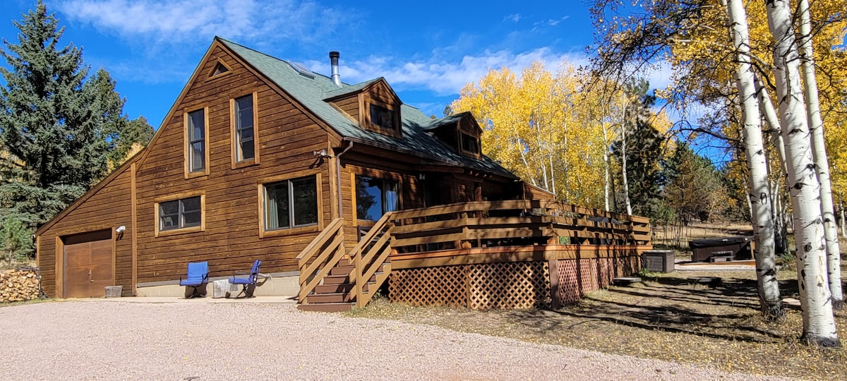 Relax with the family at this peaceful escape in Colorado’s nature w/ a HOT TUB and backside view of Pikes Peak! Imagine sipping your morning coffee on the deck as you watch the sun rise, or roasting marshmallows over the firepit with Colorado nature all around you! Peace and tranquility! Minutes from the town of Woodland Park for conveniences, but far enough away to be completely unplugged and away with family and friends. (Incl 15% AirBNB fee) Please read the cabin rules, 5 adults(13+) MAX.