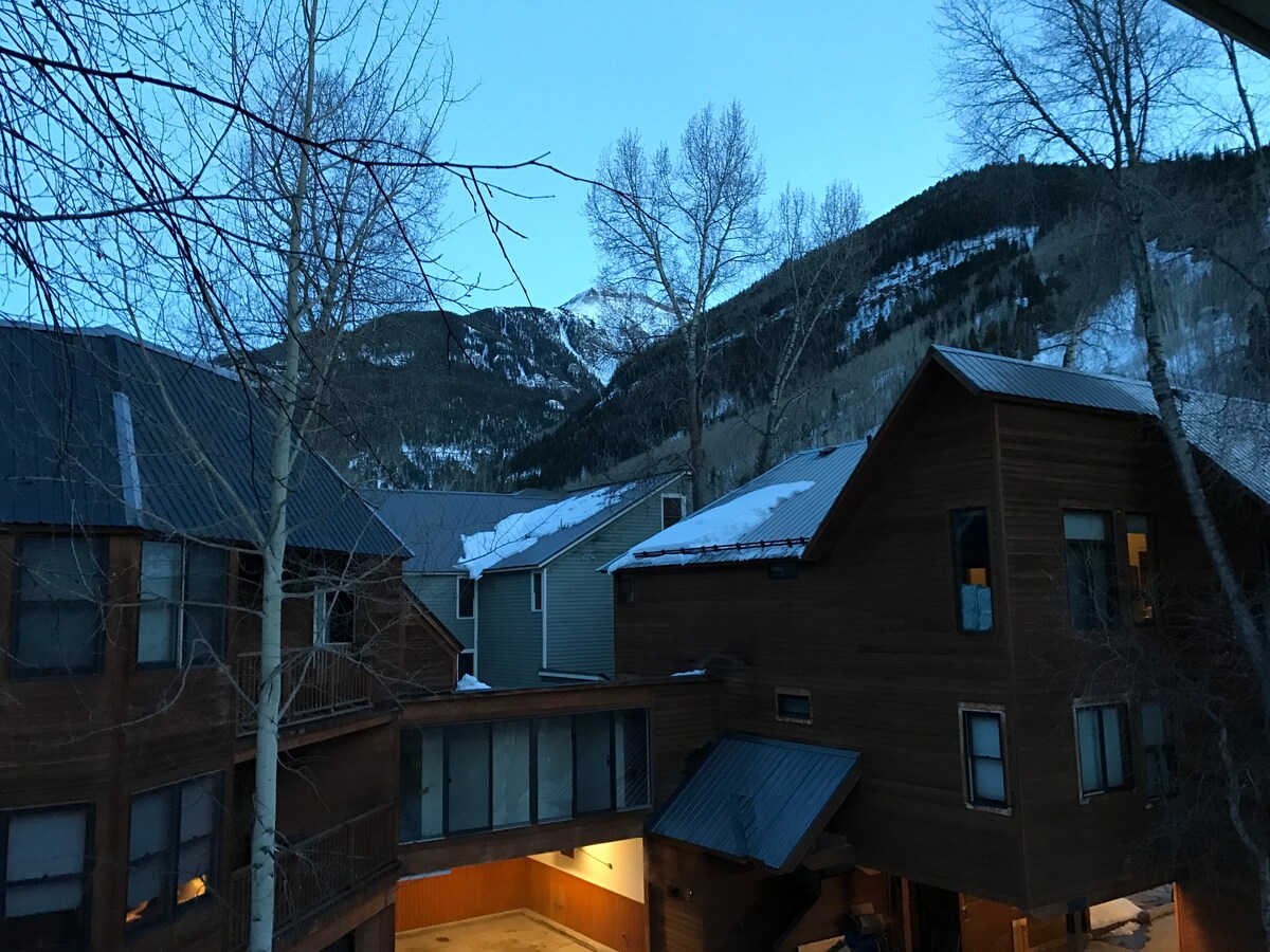 ¡Hermoso condominio de esquí en Telluride para tu escapada perfecta de fin de semana largo (o de una semana)! La luminosa unidad de un dormitorio y estudio incluye una cocina bien equipada y lavadora y secadora en la unidad. ¡Recién amueblado y elegantemente equipado! ¡La ubicación en la ciudad está a minutos de todo lo que Telluride tiene para ofrecer! Si necesitas billetes de ascensor, el mostrador de ventas está en el edificio, y el ascensor está a solo unos pasos de la puerta. ¡Esquí toda la mañana, calienta con sopa y luego vuelve a deslizar hacia las pistas! #00081