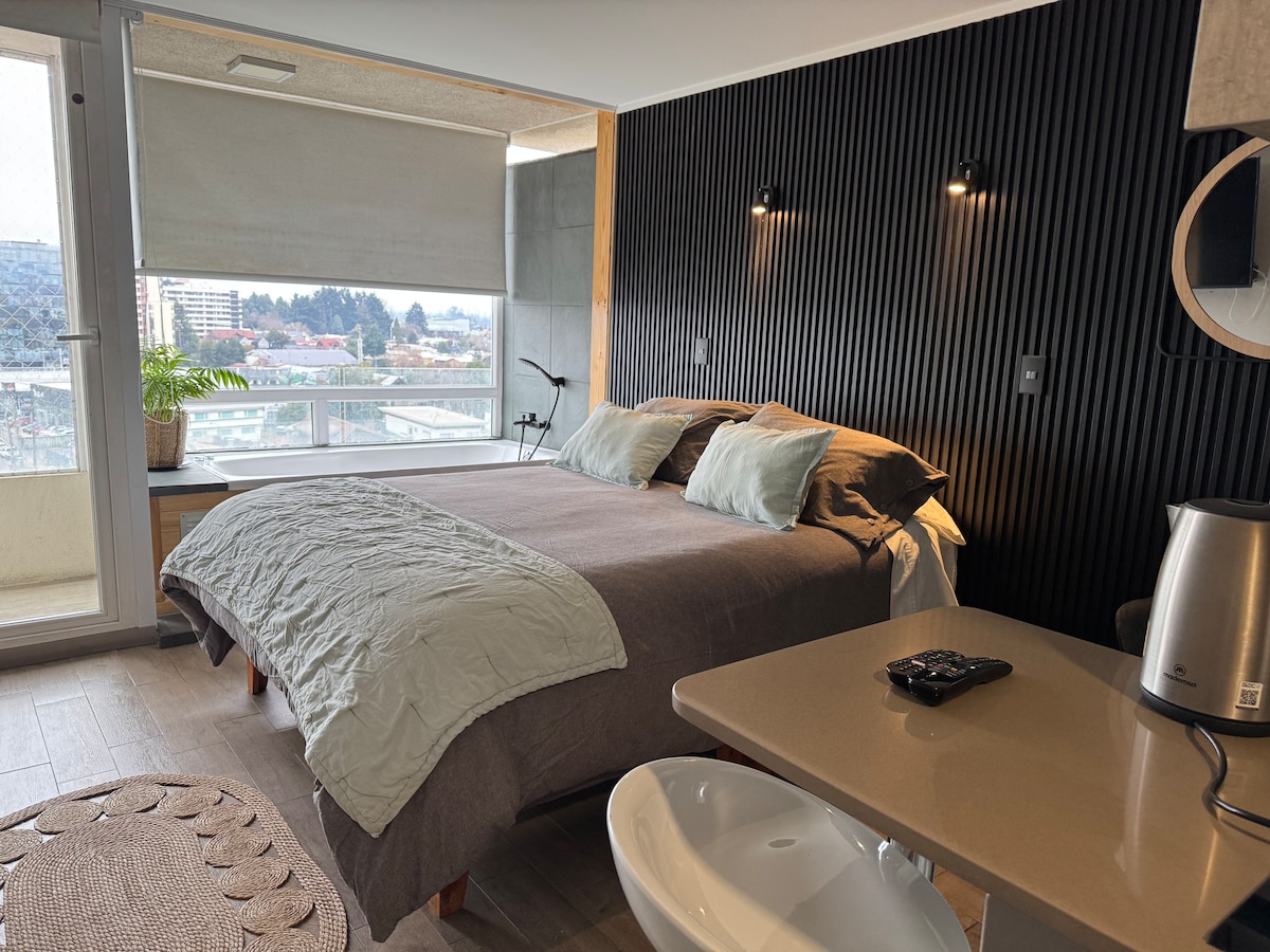 Estudio moderno y acogedor cerca del Portal Temuco. Ideal para viajeros, profesionales o estudiantes. Totalmente equipado: WiFi rápido, cocina completa, Smart TV, calefacción, artículos de baño, ropa de cama y estacionamiento privado. Zona segura y conectada, a pasos de clínicas, mall y universidades. Limpieza profesional, atención personalizada y retiro de llaves en conserjería. ¡Confort, ubicación y estilo en un solo lugar!
