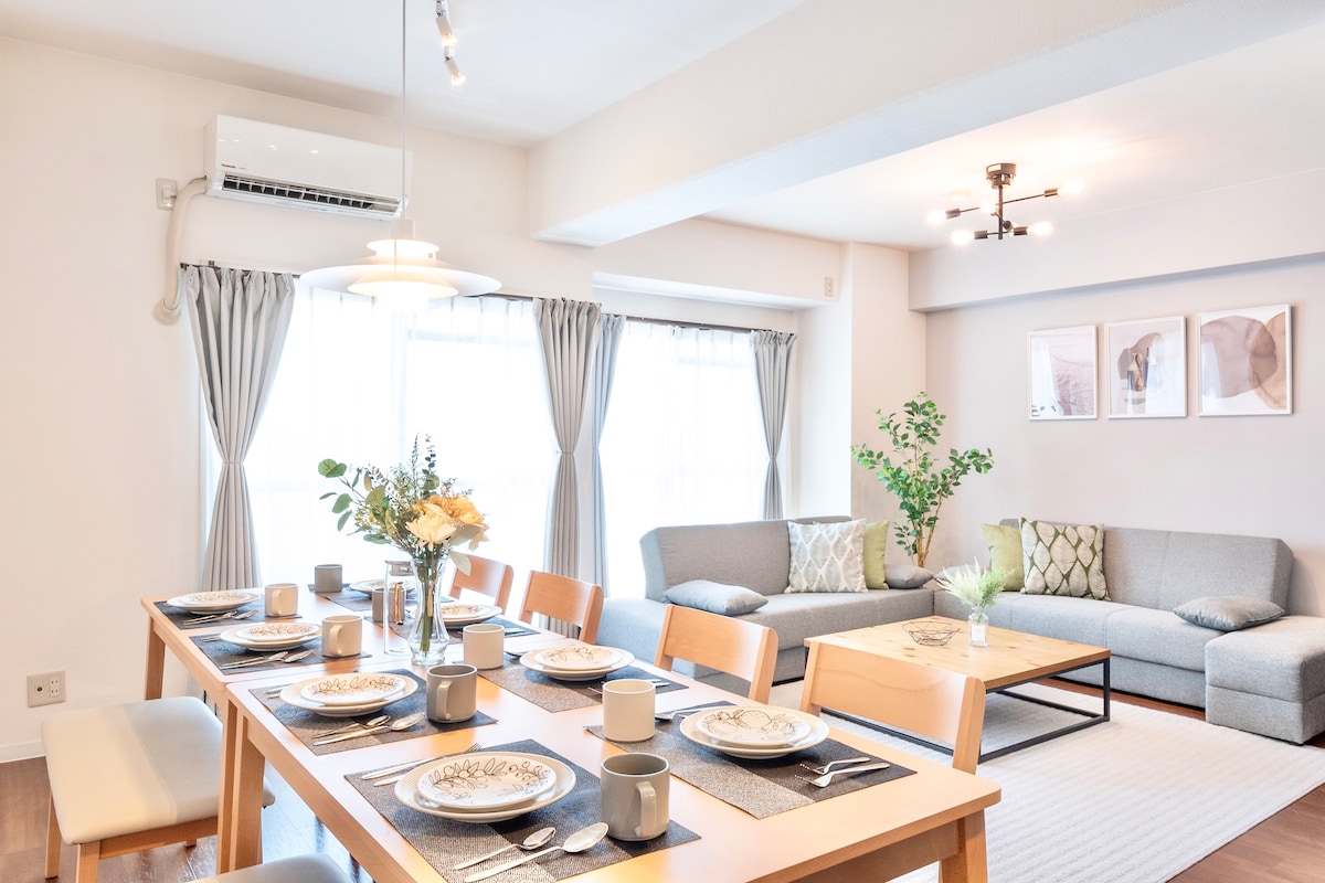 Alquiler vacacional con licencia: ¡ideal para grupos y familias! 2 dormitorios occidentales y 1 habitación tatami WiFi de 2 bolsillos e internet de fibra de alta velocidad Aire acondicionado en todas las habitaciones Televisión de 50pulgadas con Netflix, YouTube Lavadora y secadora Calefacción por suelo radiante en la sala de estar. ¡Cómodo, totalmente equipado! Estación de metro Doubutsuen-mae: 2 minutos a pie Estación JR Shinimamiya: 4 minutos a pie. Tennoji: 7 minutos a pie NAMBA & NIPPONBASHI DENDEN Town: 2 estaciones SHINSAIBASHI: 3 estaciones No se necesita traslado al aeropuerto y Kioto USJ: 28 minutos en JR
