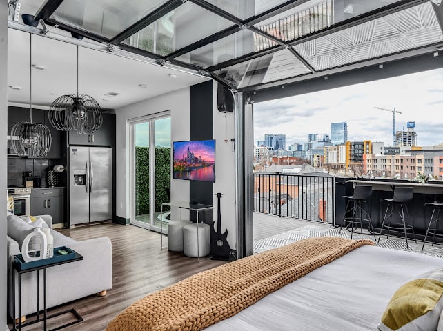 Discover this one-of-a-kind industrial-chic loft in Nashville’s prime spot. Soaring ceilings and an open layout create airy vibes, accented by bold textured crocodile wallpaper, lush green plants, and eclectic details that inspire. Relax on the spacious patio—your urban oasis steps from dining, music, and attractions. Blending luxury, personality, and cozy comfort, it’s the perfect creative escape for couples or solo travelers seeking something truly unique.