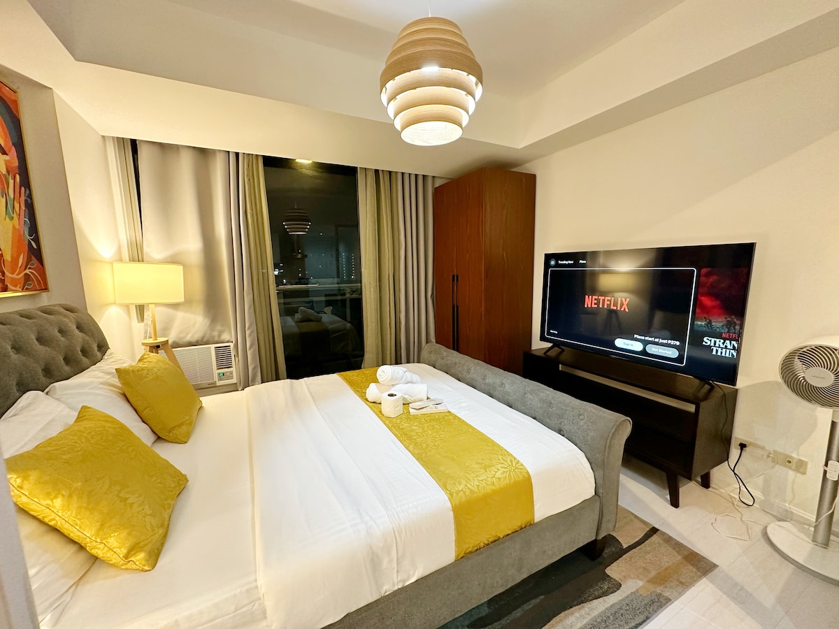 Diseñado cuidadosamente con un toque moderno, este acogedor estudio en el piso 43 ofrece comodidad y conveniencia para viajeros, parejas o trabajadores remotos. Disfruta de mañanas tranquilas y noches de descanso sobre el perfil urbano. • Cómoda cama tamaño queen con sábanas limpias • Equipado con plancha y secador de pelo para su comodidad • Espacio limpio y acogedor para una estancia relajante • Cerca de Robinsons Place, Intramuros y Luneta Park • Situado justo enfrente de la embajada de EE. UU. en Manila