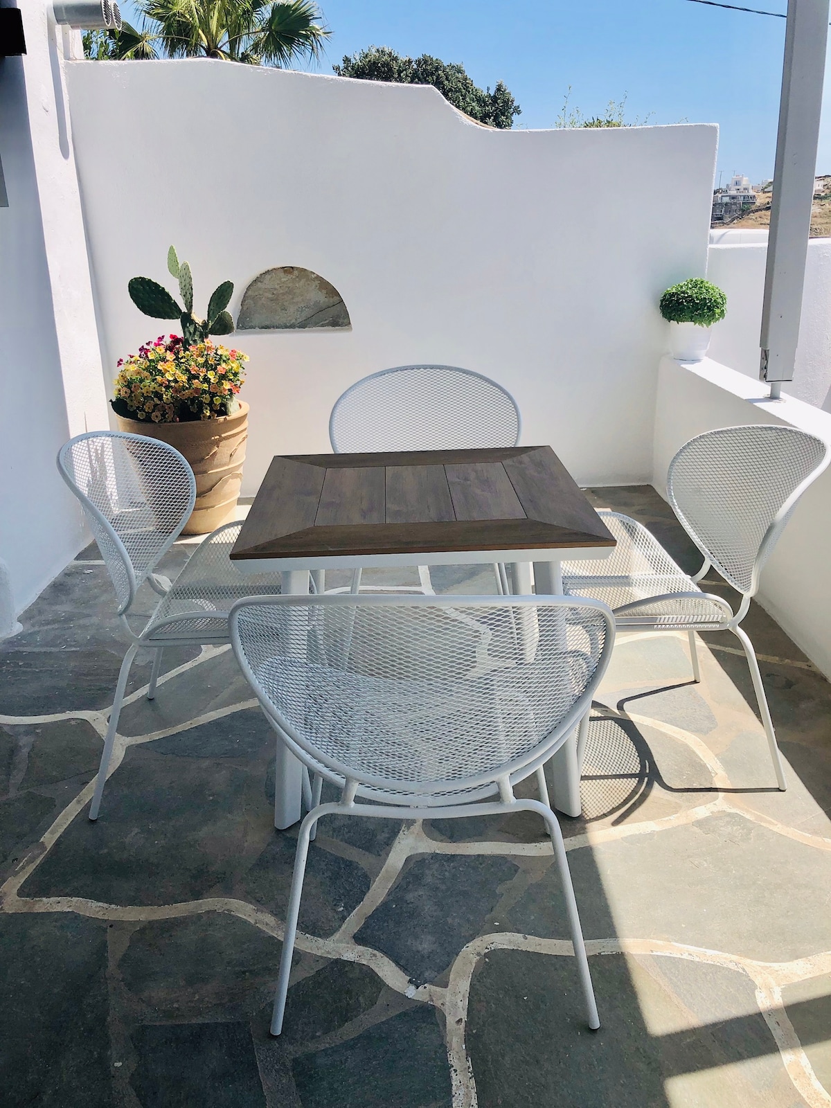 Abre las contraventanas azul marino y deja entrar la brisa refrescante, luego prepara un refrigerio en la encimera de hormigón de la cocina urbana en un refugio frente al mar. ¡Entra en la espaciosa y frondosa terraza para disfrutar de unas tranquilas bebidas al atardecer con vistas panorámicas al mar! El apartamento está situado junto a una playa de arena para nadar por la mañana y a 2 minutos a pie del centro de Naousa y su plaza principal. A pocos pasos hay tiendas, restaurantes, bares y clubes, ¡pero la zona es muy tranquila y silenciosa!