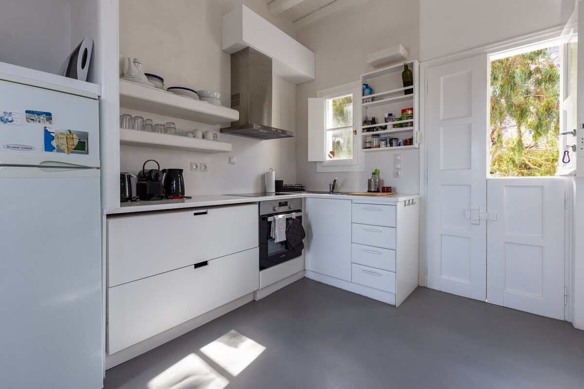 Arquitectura cicládica. Vista panorámica superior. Amplio, lujoso y cómodo. Cerca del centro del pueblo de Tholaria. Ideal para unas vacaciones relajantes y cómodas. El alojamiento tiene capacidad para 4 personas, 1 dormitorio, 1 baño, amplio salón/cocina totalmente equipada, 2 grandes balcones. Casa completa con 1 dormitorio doble, 1 baño, sala de estar con 2 camas individuales, zona de cocina totalmente equipada, mesa de cocina, SmartTV, wifi, Netflix, aire acondicionado, cafetera espresso, barbacoa de gas, entrada/salida autónoma.