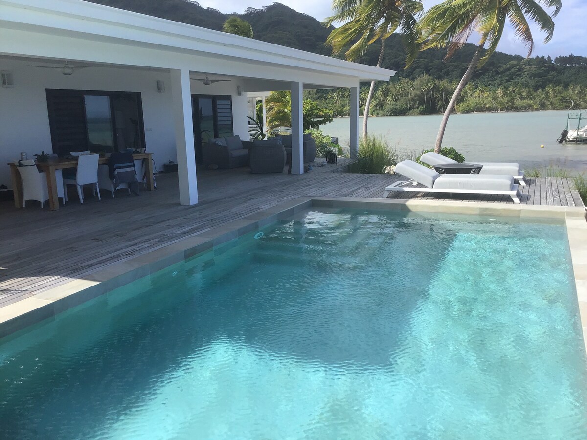 Villa au bord de l'eau avec piscine et vue sur Bora Bora, côté coucher de soleil, avec grande terrasse de 50m carrés, bar privé dans le jardin. 2 chambres climatisées Nous mettons à disposition et gratuitement : 1 kayak simple 1 kayak double 5 vélos standards