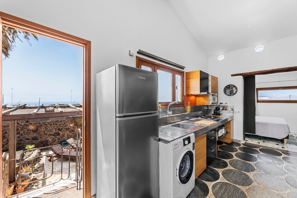 Amplio apartamento tipo loft con techos altos y magnificas vistas al mar y a Fuerteventura. Dispone de dos enormes camas con buenos colchones de descanso y una pequeña estufa de leña. Se encuentra dentro de una parcela más grande que comparte con otro apartamento y la vivienda principal de la propietaria de la casa. Allí pueden encontrar una gran terraza más azocada junto a la huerta de la vivienda en la podrán tomar el sol o comer y disponen de una bonita ducha en la que podrán refrescarse.