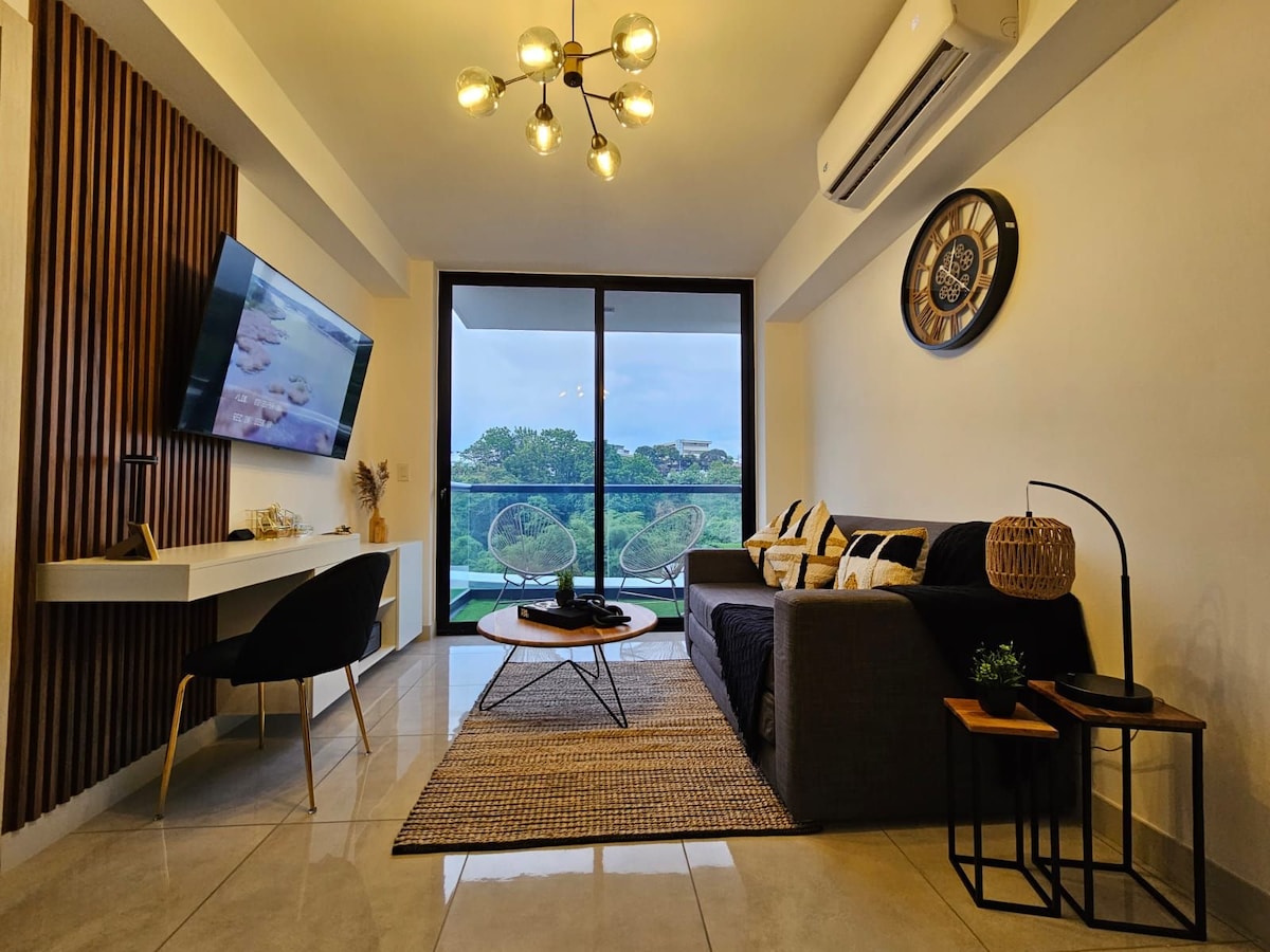 Brand new luxury apartment at Nucleo Sabana. It has a minimalist style with all the appliances brand new, including A/C, 2 smart TVs. High speed internet with TVservice. Laundry room includes a washer/dryer, 2 in 1. It has a wonderful view to the top of the trees and the sky in the balcony. There is a river next to it so you can always enjoy the river sound. Complex: More than 30 amenities, including a gastronomic market(NucleoGastro). Located 10min from Juan Santamaría Int’l Airport (SJO).