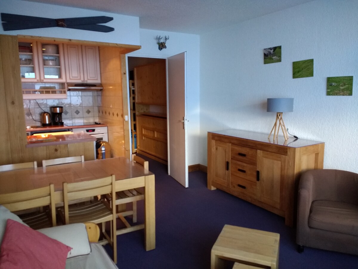 Estudio con todas las comodidades clasificado 3 estrellas totalmente renovado. Agradable estancia muy luminosa, equipada con un sofá cama de 140 nueve y un sillón convertible de 1 plaza. TV de pantalla plana. Cocina nueva equipada con vitrocerámica, lavavajillas, microondas, tostadora, hervidor de agua, cafetera, raclette, batidora, batidora, todo para cocinar. Balcón terraza. Residencia situada a 50 m de la salida de las pistas y de la parada de autobuses que comunica con toda la estación de forma gratuita las 24 horas.