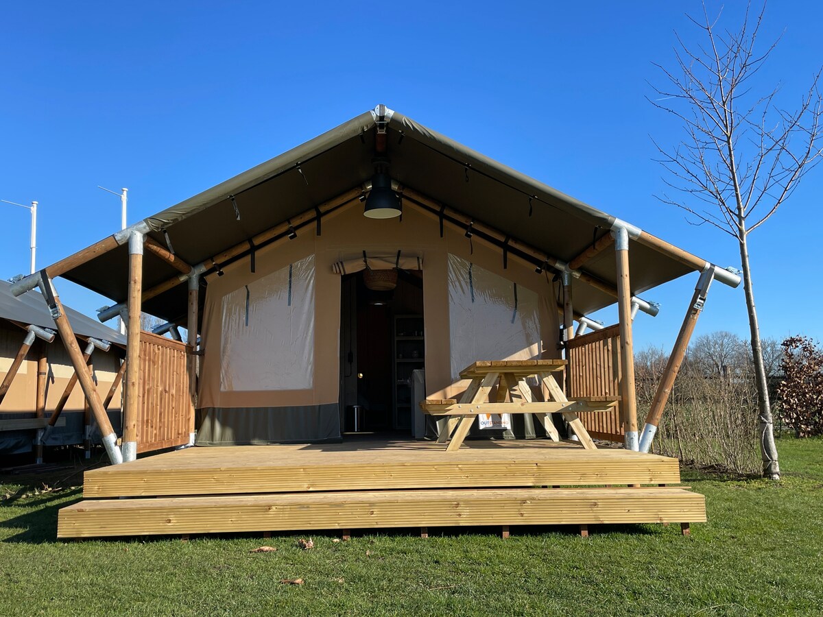 Tienda de safari de lujo en el tranquilo minicamping Petit013. La hospitalidad, el lujo y la comodidad son nuestra prioridad. La tienda tiene su propio baño de lujo con ducha, lavabo e inodoro. La cocina está totalmente equipada con vajilla, utensilios de cocina y paños de cocina. Hay ropa de cama por persona y las toallas de baño están listas (incluidas en el precio). Ven a disfrutar de la paz y el espacio. Despiértate relajado por la mañana y toma una copa al atardecer o bajo el cielo estrellado en tu propia terraza.