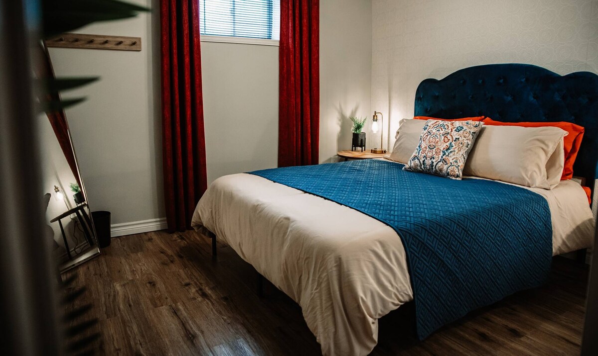 Welcome to Le Bleu Marin, longer stays welcome!! This retro-moody inspired, 2 bedroom 1 bathroom basement suite can accommodate up to 4 guests. The space has been recently renovated with guest comfort in mind. Guests can enjoy the comfortable velvet couch & lounge in the hanging chair. On those chilly winter nights, turn on the fireplace and relax while watching your favourite streaming program on the 55" smart TV. The shared driveway can accomodate two vehicles.