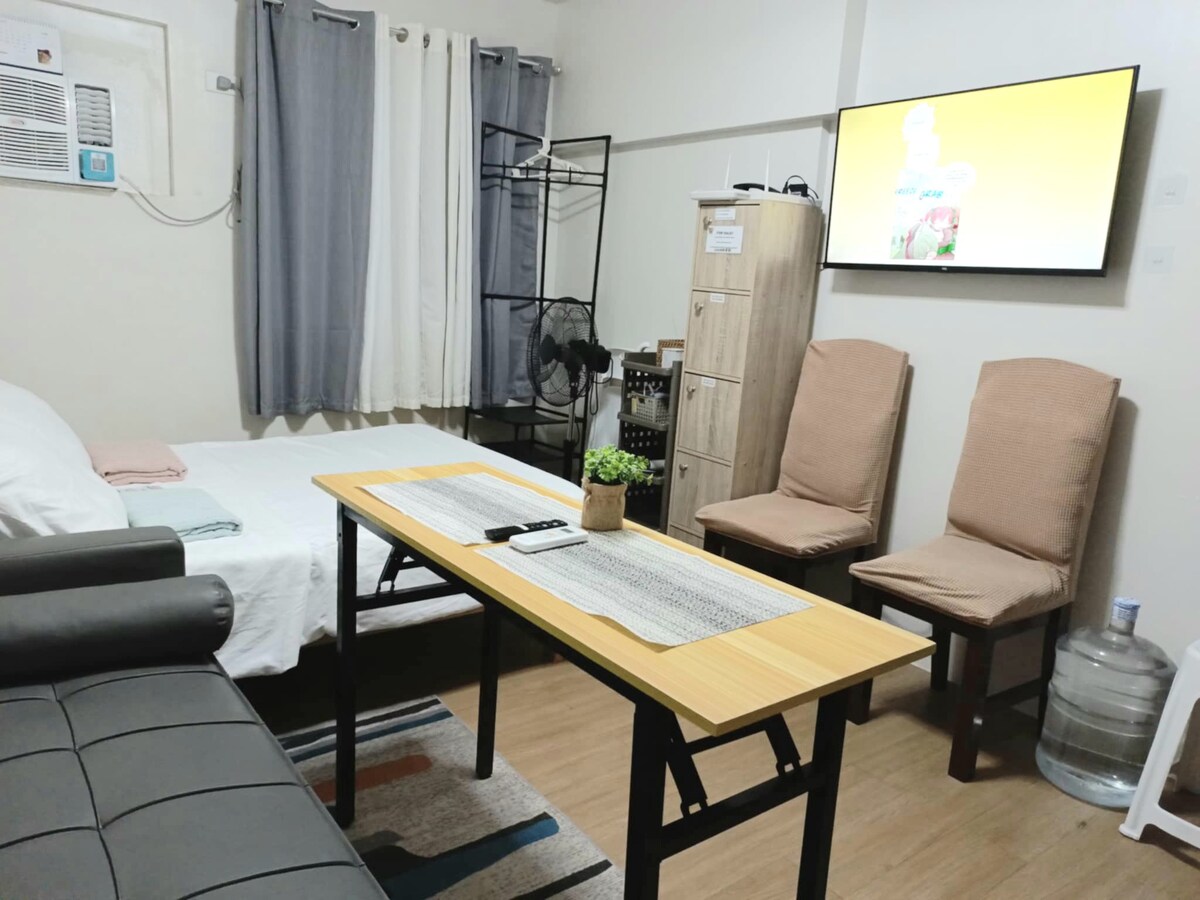 Tu hogar lejos de casa. ¡Un lugar acogedor, elegante y asequible donde puedes pasar tus vacaciones! 💛 Características y servicios: ● Totalmente amueblado Equipos y utensilios de cocina● completos. Wifi de● alta velocidad. ● Aire acondicionado. Televisor de pantalla plana de● 55 pulgadas y Netflix. Ducha ● fría y caliente. ● Gimnasio ● Piscina Zona de● estudio. Ubicación: ¡Justo en el corazón de la ciudad de Cebú! A ● 8 minutos de Ayala, parque empresarial de Cebú. A ● 10 minutos del parque informático. A ● 15 minutos del centro de Colon. ● Cómodo acceso a lugares turísticos.