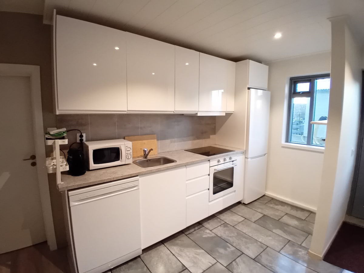 Friendly two bedroom apartment in the heart of Húsavík. 5 minute walking distance from the harbour and 10 minute walking distance to GeoSea Thermal Baths. Apartment has one bedroom with two single beds, tv and an arm chair and one bedroom with a double bed, tv and a sofa! Fully equipped kitchen, washing machine and a dryer!