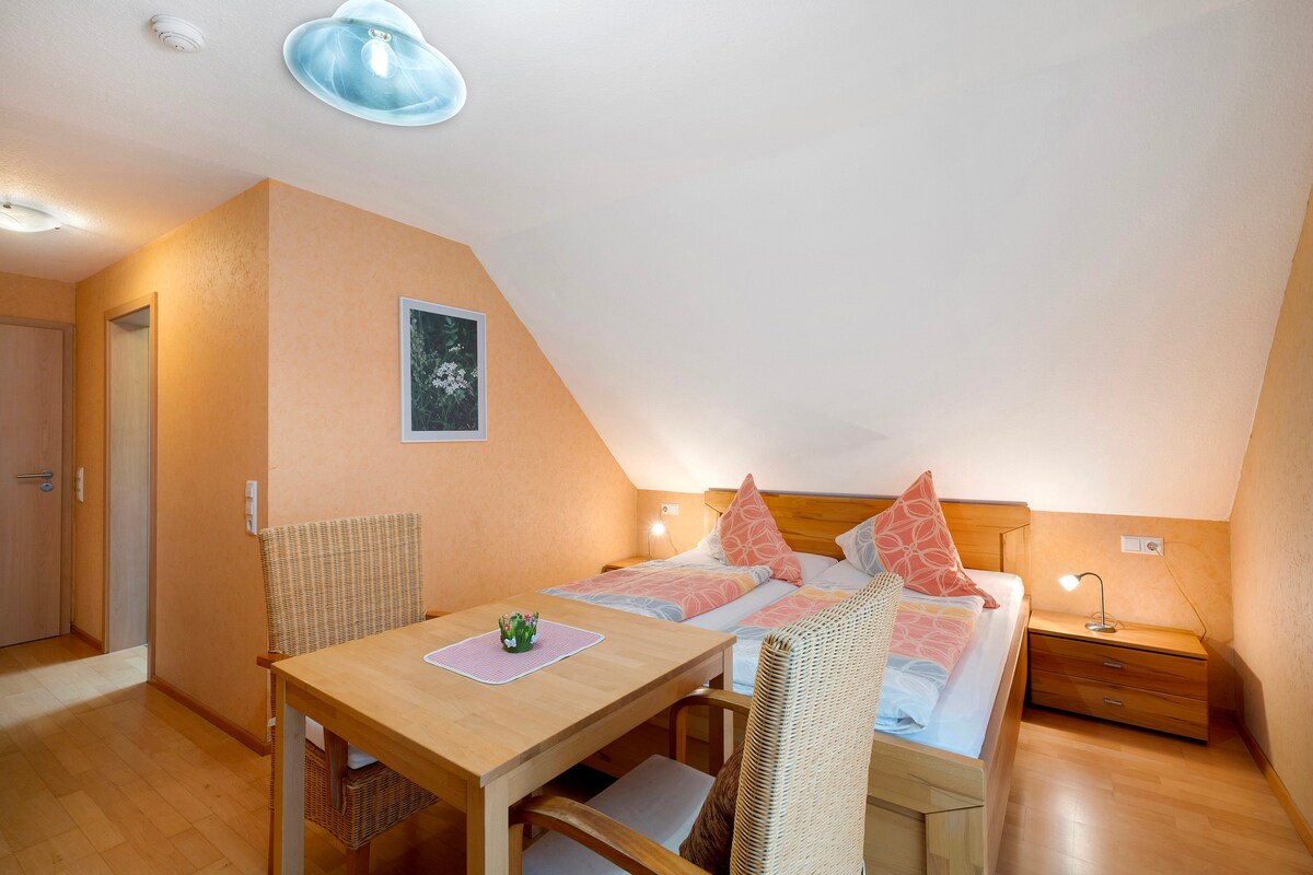 La "Gänseblümchen" - una habitación doble con baño/WC y balcón, no enorme, pero con todo lo necesario. Un armario, un amplio cuarto de baño, un dormitorio con cama doble, televisión y mini nevera y un balcón con vistas al bosque y sol de la mañana. Esta habitación se puede reservar como complemento de cualquier apartamento de vacaciones o como habitación con desayuno. El desayuno se sirve en el salón de nuestra granja.