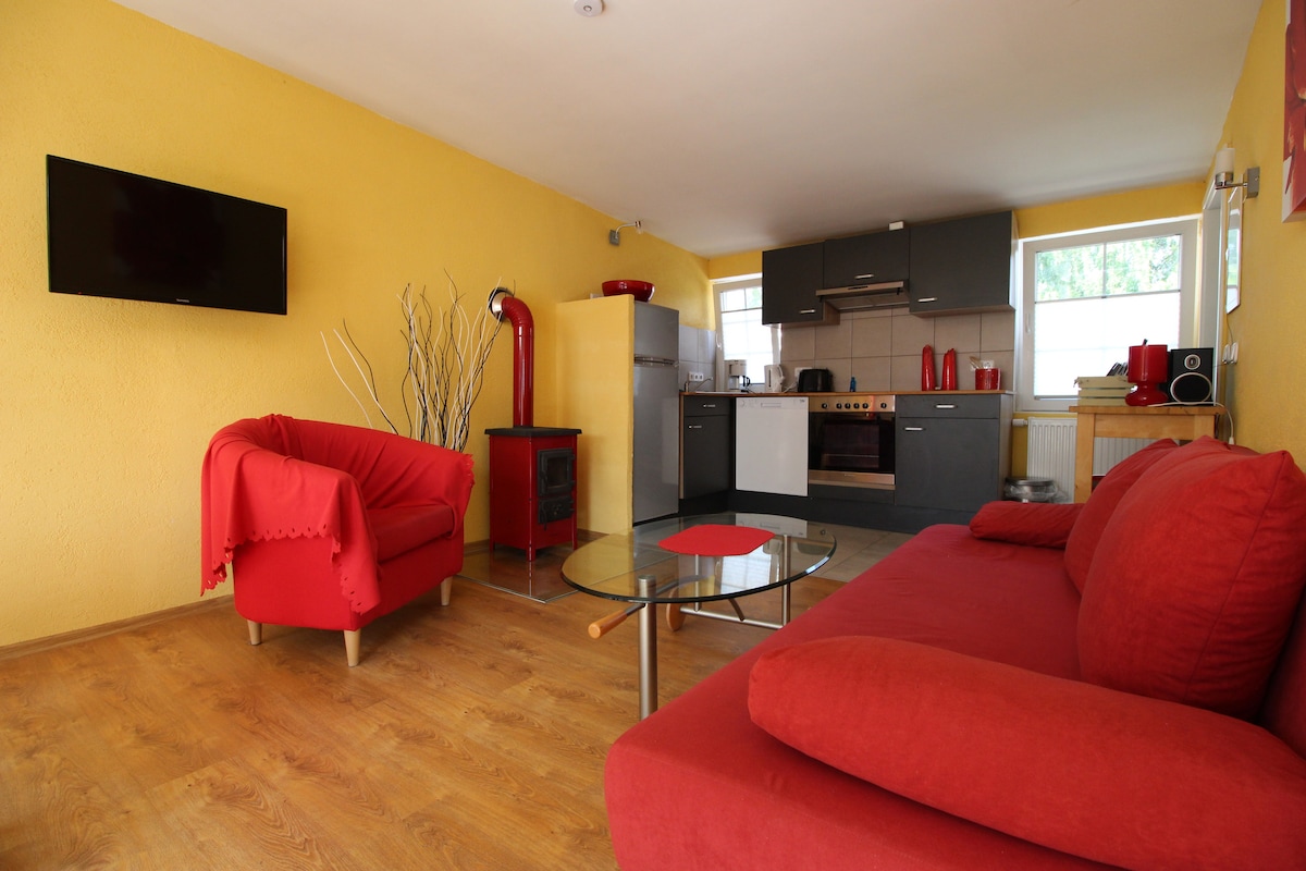 En este acogedor alojamiento para 2 - 4 personas, sin duda te sentirás muy cómodo. Los 55 metros cuadrados estarán amueblados con muchos detalles individuales. Todavía estamos en proceso de renovación, las fotos del interior seguirán. Es posible tener unas vacaciones completamente aisladas o buscar encuentros con los huéspedes de las 3 tiendas de campaña de glamping. Ofrezco caminatas semanales, talleres de hierbas y cocina con fogatas. Si quieres, puedes ajardinar conmigo descalzo... (es una experiencia) ;-D