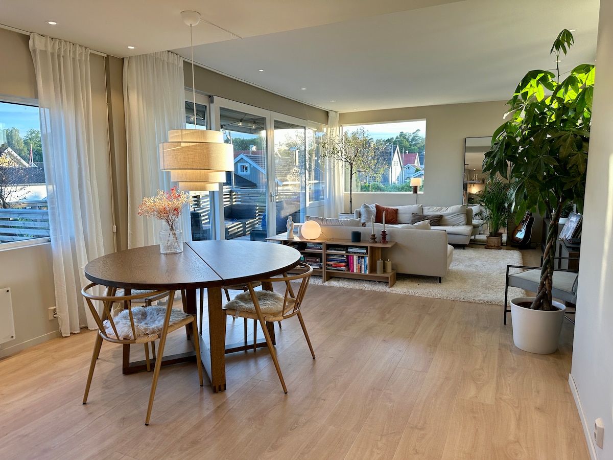 Velholdt hus i fredelig nabolag med god atmosfære og i umiddelbar nærhet til både sentrum, sjøen og skogen, strender, golfbaner og turstier. Kun 10 minutters gange til brygga og sentrum. 3 soverom og en stor terrasse rundt huset med gassgrill, og hagemøbler. I stuen er det 75» TV med flere strømmetjenester og de fleste kanaler, stor sofa og en nybygget peis. På soverommene sover dere i komfortable dobbeltsenger i god kvalitet. Nytt kjøkken med alt nødvendig utstyr.