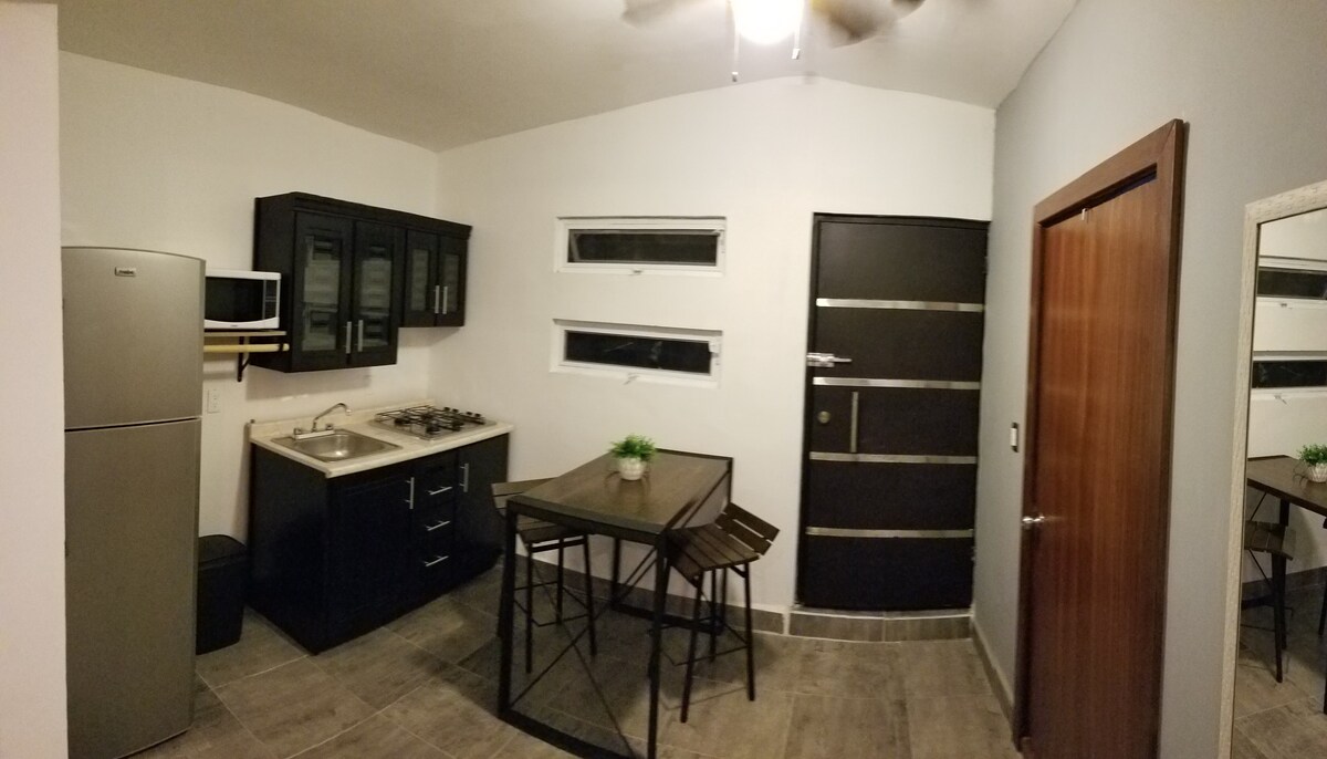 Padrísimo y super cómodo departamento tipo loft con entrada independiente. Está ideado para dos personas pero podría entrar una tercera pues se tiene un sofa cama. Recién remodelado con muebles nuevos! Excelente ubicación, a 1.2 Km del IMSS 16 y de especialidades, a 3 minutos de BLVD de alta afluencia, centros comerciales, restaurantes, etc Tendrás todas las comodidades WIFI, aire acondicionado, TV por cable, agua con fuerte presión y disfrutar de la noche en una bonita terraza.