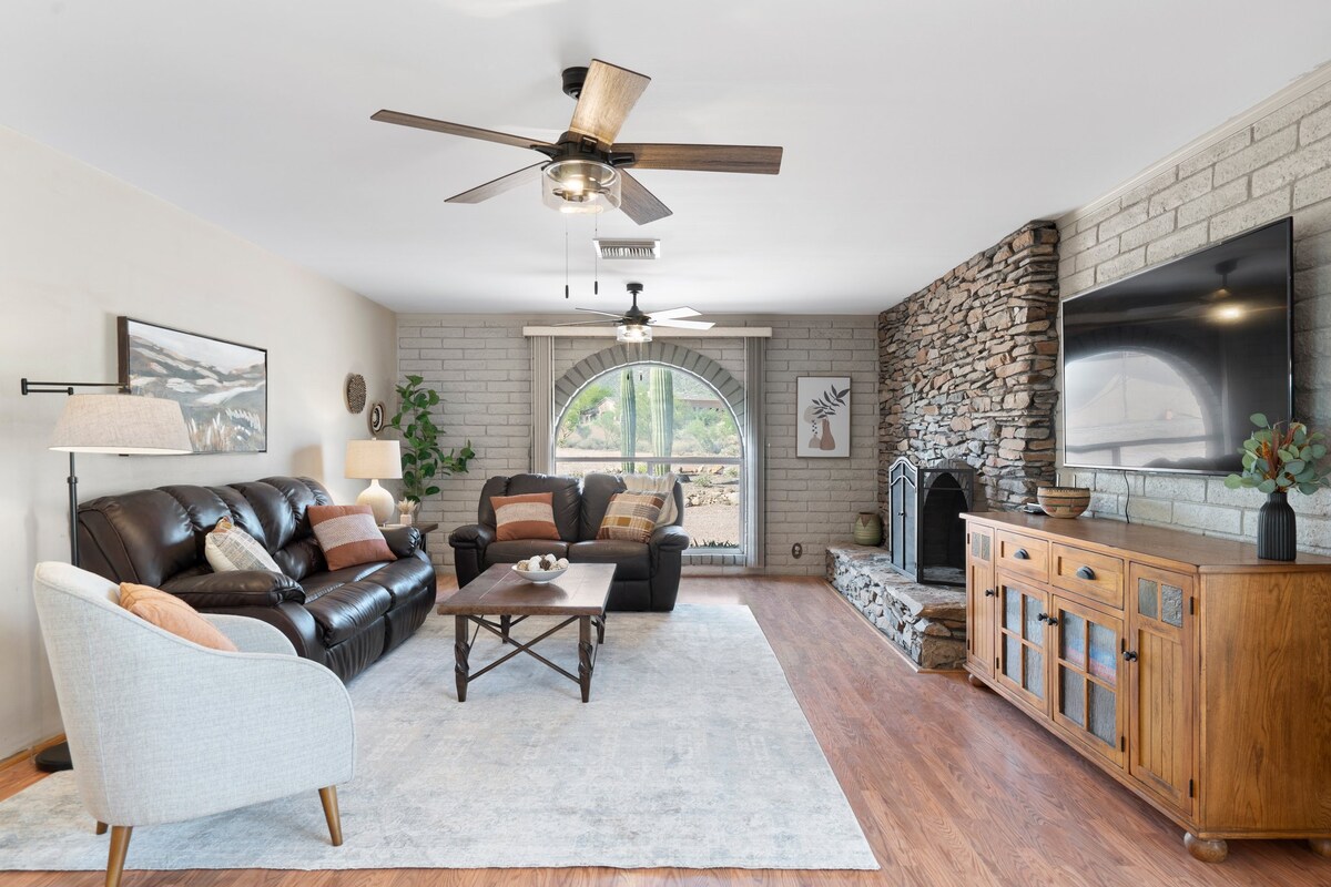 Casa de una sola planta de 1600 pies cuadrados recientemente renovada. Paisaje desértico en 1,25 acres con gran patio vallado. Cocina totalmente equipada, sala de estar, TV inteligente, lavandería, 3 dormitorios y 2 baños, wifi, espacio de trabajo dedicado, chimenea. A minutos de senderismo/ciclismo en las espectaculares montañas Superstition o el Bosque Nacional Tonto, kayak/navegación/pesca en Canyon Lake y Salt River. Cerca de las autopistas US 60 y Loop 202. A 30 minutos de los aeropuertos Phoenix Skyharbor y Phoenix Mesa Gateway. Los propietarios viven cerca.