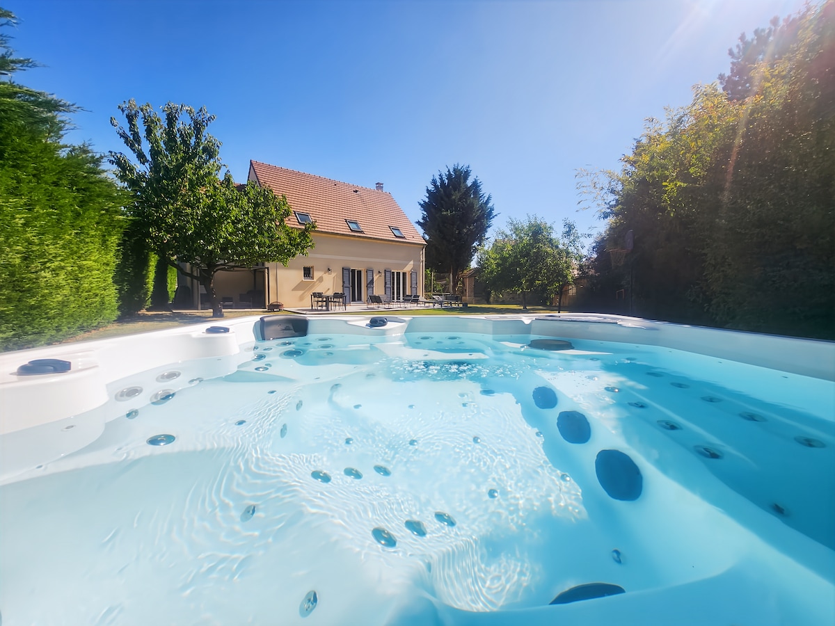 Cálida casa en el campo, ideal para 8 viajeros. Disfrute de un gran jardín, terraza, jacuzzi y todas las comodidades modernas. Situado en Plessis-Feu-Aussoux, a 10 minutos del Parc des Félins, a 30 minutos de Disneyland, Parrot World, el Valle Village, Vaux-le-Vicomte y Provins. París está a 1h. ¡Perfecta para reponer energías en familia o entre amigos! Spa disponible todo el año. Depósito de 1000 € mediante autorización bancaria, no se realiza el cargo.