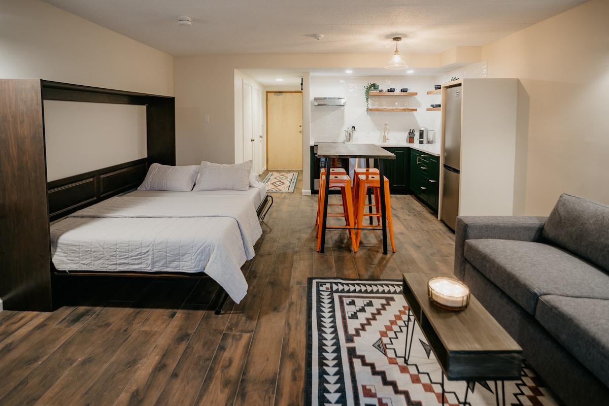Esta habitación es la mitad de una planta en nuestro edificio de estudio (35 metros cuadrados). Es el único espacio ocupado en el edificio, que está separado de la casa principal por un patio. Hay una cama tamaño queen, baño completo (ducha sin plato) y una ducha al aire libre (no disponible en invierno). Pequeña cocina con fregadero, nevera, placa de inducción de 2 fuegos, horno microondas/de convección, tostadora, cafetera y utensilios de cocina. Techo abovedado, con ventilador de techo, grandes ventanales, terraza y el arte botánico de Maggie que recubre las paredes.