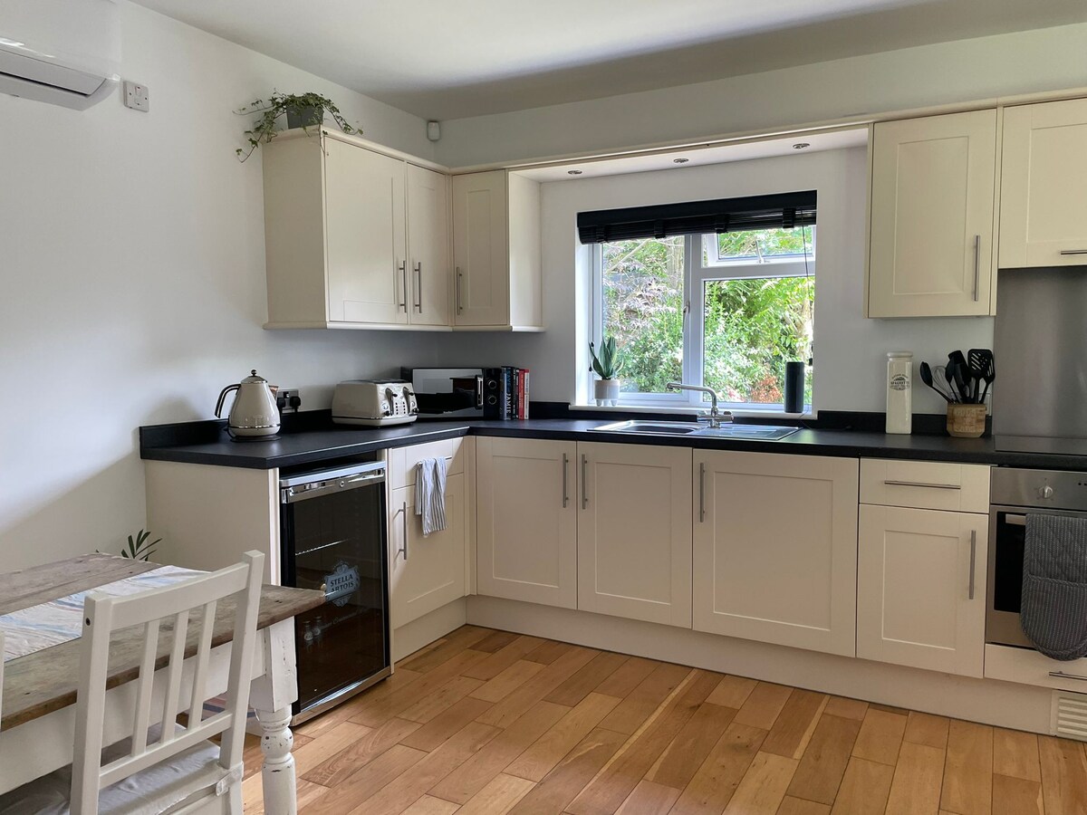 Hermosa, lujosa, luminosa, espaciosa, revestida de ladrillo negro Garden Bothy. Autónomo. La puerta plegable se abre a una gran terraza orientada al sur con preciosas vistas a nuestras tierras de cultivo. Cama doble, sábanas de hilo de alta calidad y toallas abundantes. Moderno baño de lujo con gran ducha de efecto lluvia. A poca distancia a pie o en coche de Merrydale Manor Wedding Venue y a menos de 5 minutos en coche de Colshaw Hall. Se puede caminar hasta el excelente pub "The Dog". A poca distancia de la estación de tren principal a Manchester-Crewe.