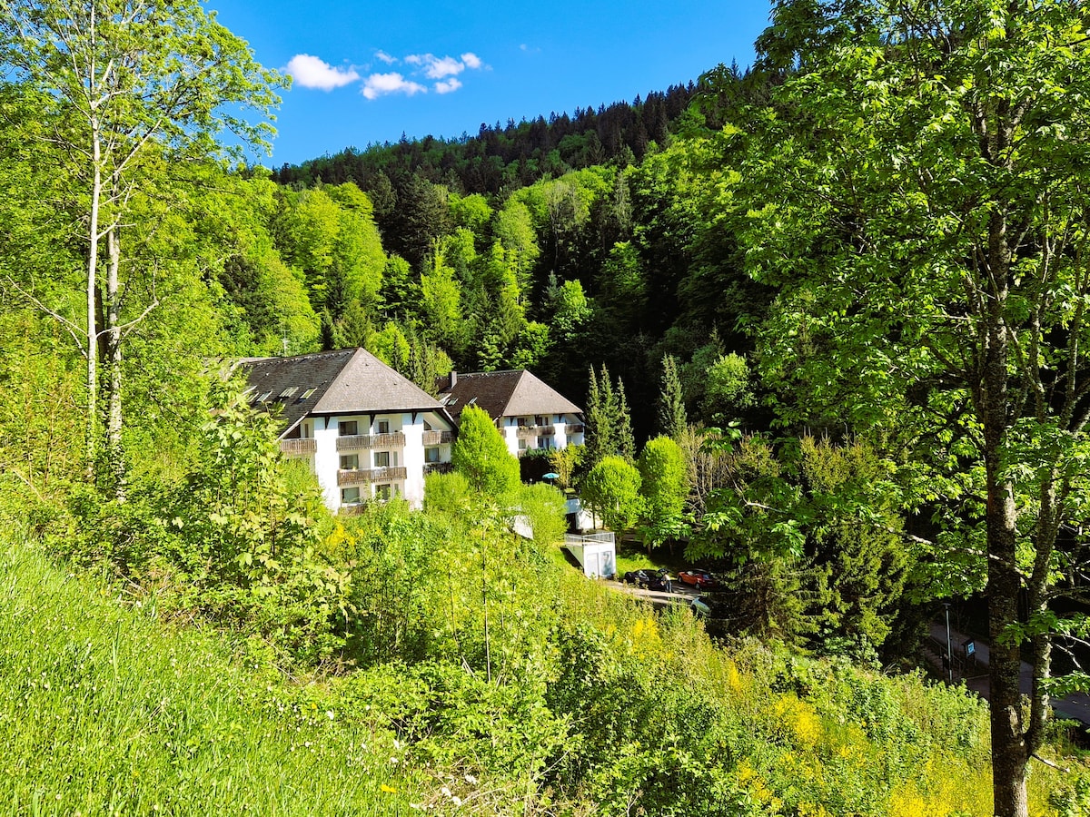 Acogedor departamento (40 metros cuadrados) con balcón. Vista del hermoso paisaje de la Selva Negra. Orientación sur, por lo tanto, ¡sol todo el día! Rutas de senderismo directamente desde el departamento. Con ascensor. Espacio de estacionamiento en el garaje subterráneo. La lavadora está disponible en la lavandería. Servicio de pan. Piscina, sauna, futbolín, cancha de tenis, parques infantiles.