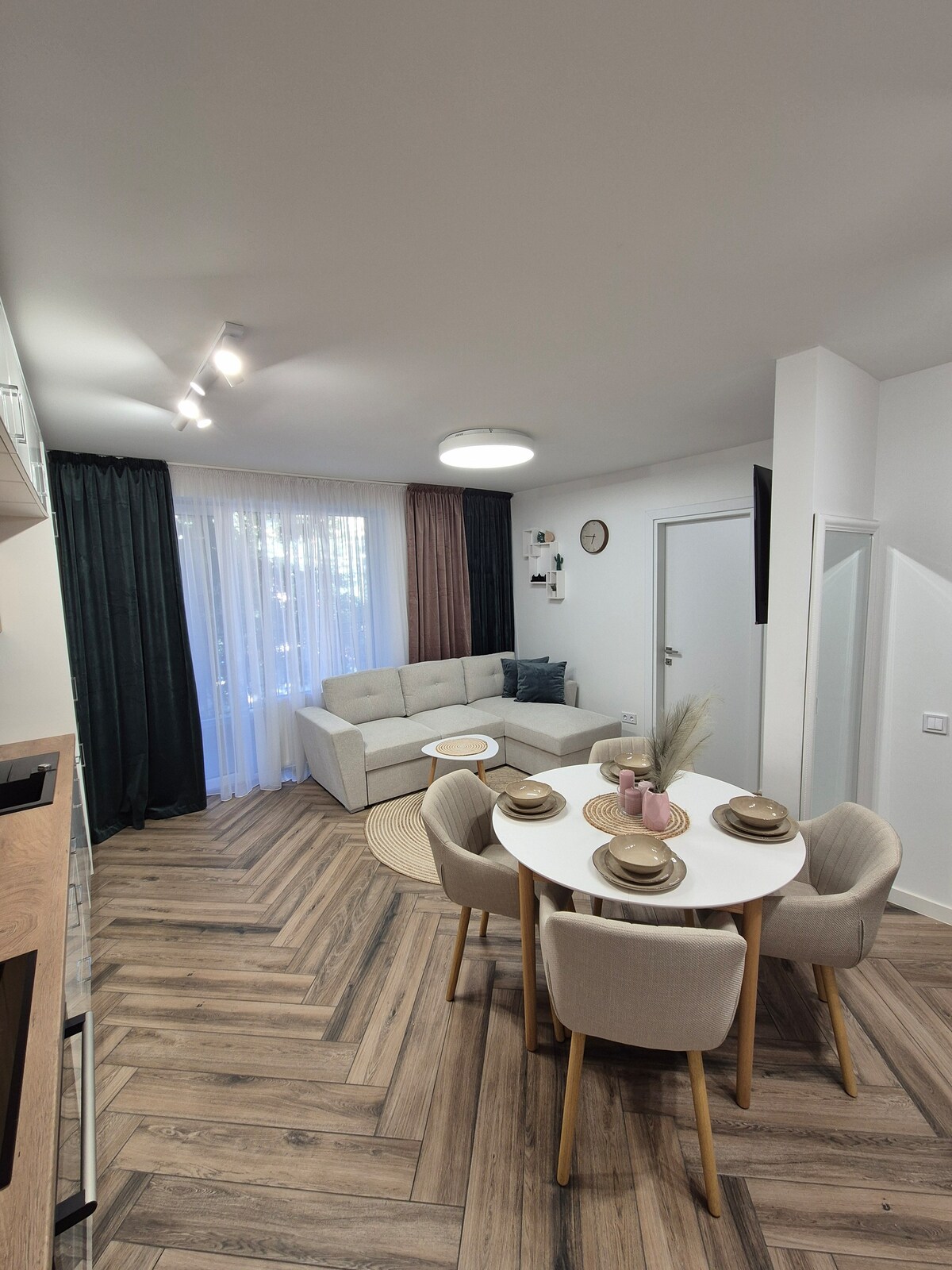 Relájate en este espacio tranquilo y elegante. Cuarto piso en un edificio de cinco pisos con ascensor. ¡Buena vista, zona tranquila a solo 500 metros del centro de la ciudad y a pocos metros del complejo deportivo! Totalmente equipado con artículos nuevos, adecuados para una estancia más larga. ¡La lavadora, la secadora son solo algunas de las ventajas!