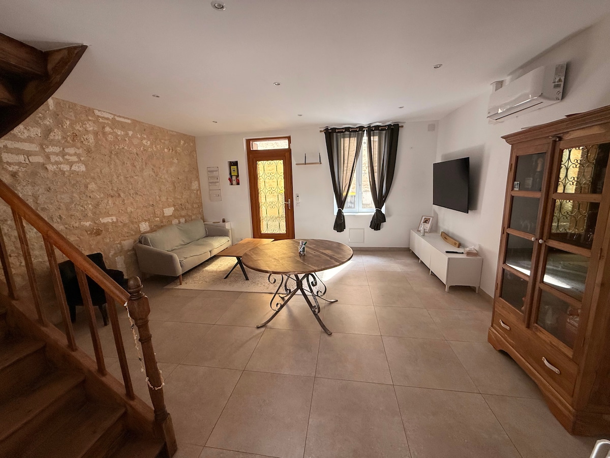 Disfrute de una ubicación en el corazón del barrio de la BD en saint cybard Angoulême, casa reformada y bien equipada para 2 personas. Restaurantes, panaderías, carnicería, mercado, estanco / prensa, cine a menos de 5 minutos andando de la casa. Bajo - 1 salón / sala de estar - 1 cocina equipada - 1 cuarto de baño totalmente renovado Planta - 1 dormitorio con cama grande con dosel - 1 habitación tipo despacho con doble orientación.