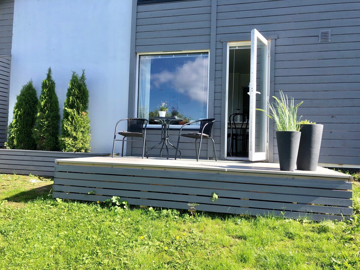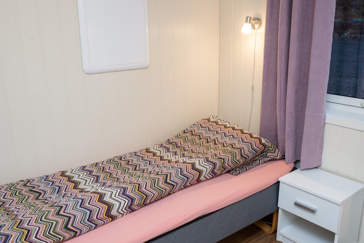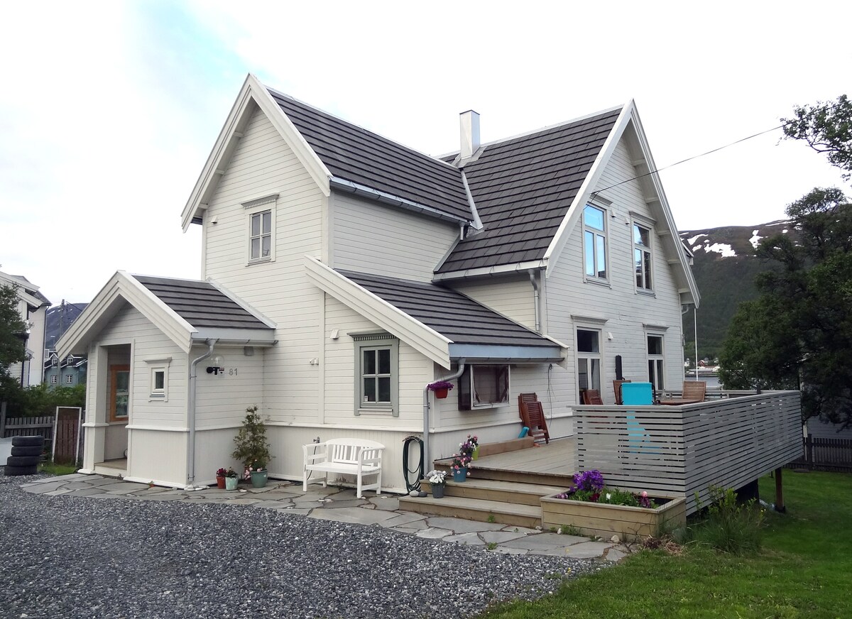 Alquilamos la planta baja de una casa en una zona residencial, a 15 minutos a pie del centro de la ciudad de Tromsø. Es una habitación estilo estudio con cama, cocina, lavavajillas, lavadora, wifi y artículos de primera necesidad. El baño es solo para huéspedes y tiene jacuzzi. Vistas al mar y a la montaña desde la ventana de la habitación.Si tienes suerte, también puedes ver las auroras boreales (septiembre-marzo). A 20 minutos en autobús urbano del aeropuerto. A 15 minutos a pie del centro Hay aparcamiento para 1 coche (tamaño de coche de pasajeros normal). Por favor, avísanos al reservar si necesitas aparcamiento. En invierno, puedes usar la plaza de aparcamiento si aceptas palear la nieve. Los niños pequeños están en el piso superior, por lo que puede ser un poco animado.Si lo sabes, envíame un mensaje. 29.07.25 actualizado Fotos renovadas Incluye sofá y jacuzzi