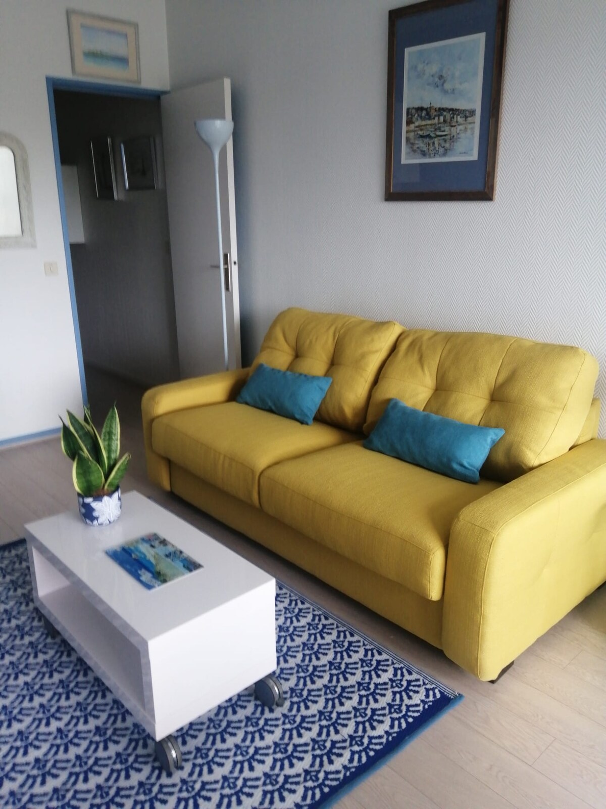 Disfrute de nuestro estudio con balcón orientado al sur y bañera de hidromasaje en la Marina. Está equipado con una cama de 160x200 con sábanas de lino, wifi, TV conectada, cocina equipada con lavavajillas, cafetera de granos orgánicos con molinillo, té orgánico y sodastream, 1 botella de sidra local fresca de regalo, wifi. Relajación asegurada en el baño equipado con una bañera de hidromasaje para una persona. Los inodoros están separados. Hay un aparcamiento gratuito al pie del edificio.