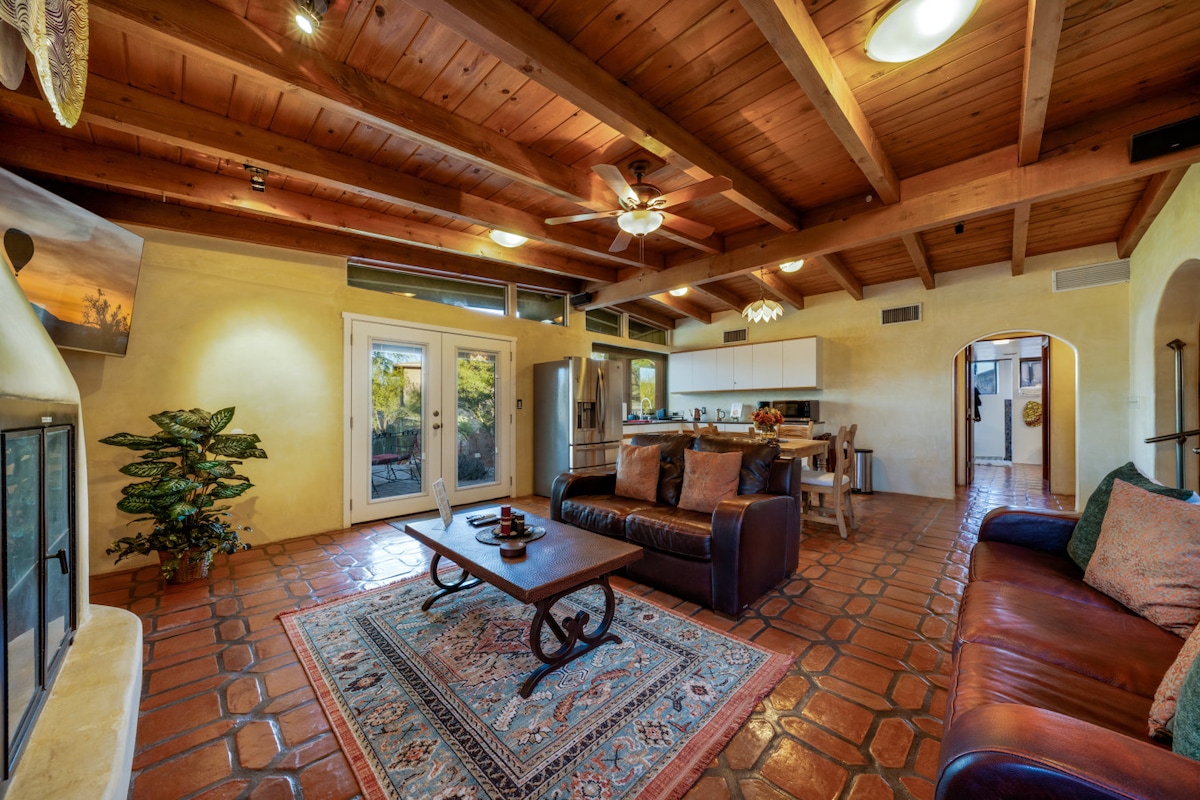 Welcome to the Owl House, a resort-like desert retreat built in classic hacienda style with modern touches and comforts and a splash of southwest. With wood beams throughout, twenty-five foot wood paneled ceilings in the entry zaguan, an iron chandelier, classic saltillo floors and Spanish talavera tiles, it will feel as if you are stepping back in time, but yet you'll be surrounded by modern luxurious amenities like a knife edge pool and hot tub, fire pit, and 48-inch stove.