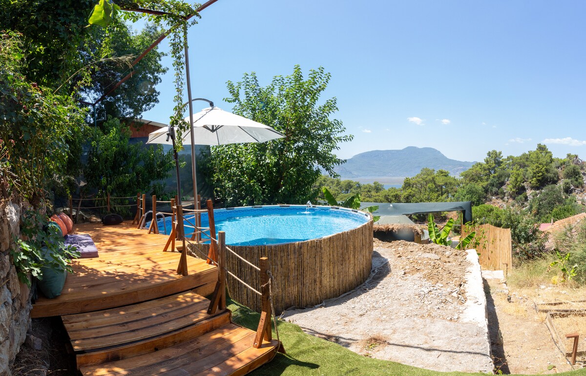 Sunyear Glamp House: la escapada tropical de Urla En el jardín tropical de 1000 m², una piscina de inmersión inspirada en Bali solo para ti bajo la sombra de los plátanos, cenador iluminado por la noche, cocina abierta y barbacoa, amplias zonas de estar y para tomar el sol. Ofrece comodidad con wifi, aire acondicionado y aparcamiento privado, ya sea para una escapada romántica, momentos divertidos con la familia o los amigos... Una experiencia vacacional completamente diferente bajo las estrellas y rodeado de naturaleza.
