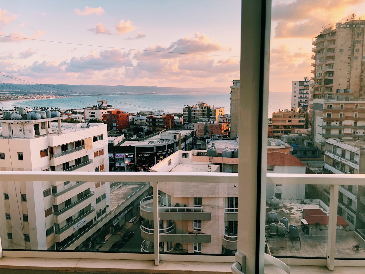 Apartamento de 220 metros cuadrados, con vistas al mar en el piso 11. Tres amplios y cómodos dormitorios y sala de estar desde allí puedes disfrutar de la puesta de sol , la cocina está equipada con todas tus necesidades . El apartamento está en el corazón de los neumáticos a cinco minutos a pie de todas partes ( cafeterías, tiendas , restaurantes, playas de arena, hipódromo romano, ruinas romanas, museo marítimo, mezquita en el casco antiguo y puerto de neumáticos) . Nota : el ascensor está disponible 24/24
