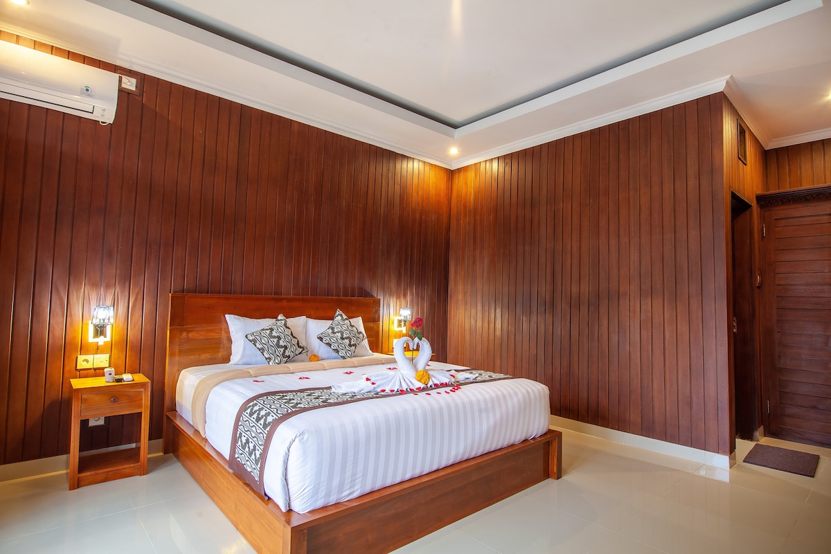 Villa nueva en una ubicación privilegiada de Ubud: • 1 acogedor dormitorio tamaño king • Elegante baño con ducha, bañera, artículos de tocador y secador de pelo • Cocina totalmente equipada. • Amplia piscina y patio, exuberante jardín tropical, perfecto para descansar o para una velada romántica. • Escritorio, caja fuerte y plancha - Wifi de 300 Mbps. • Servicio de limpieza diario con toallas y sábanas limpias • Cuna y trona bajo petición • Servicios de conserjería para alquiler de escúteres, reservas de spa y más