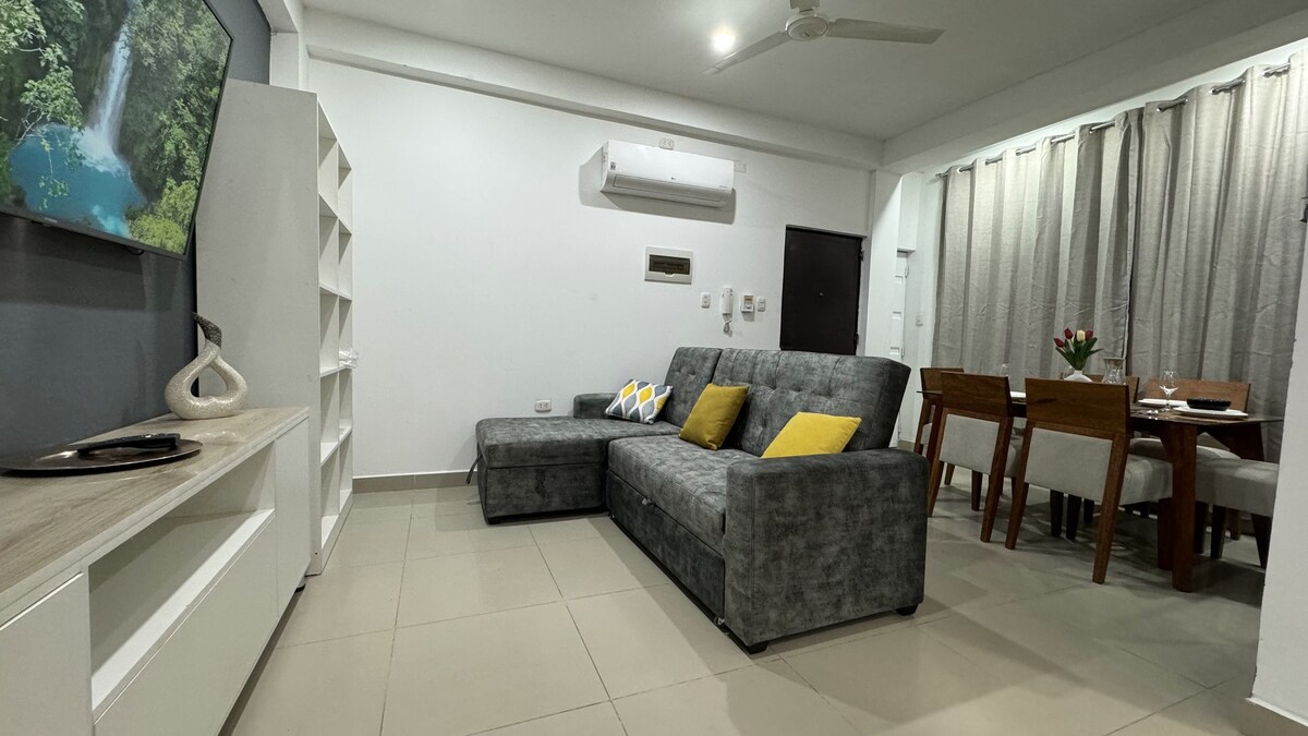 Bienvenido(a) a un espacio acogedor y ventilado, ideal para descansar y disfrutar de un ambiente familiar. El departamento es cómodo, luminoso y se encuentra dentro de un área tranquila, con acceso a un hermoso jardín y una refrescante piscina que podrás usar durante tu estadía. Este alojamiento es perfecto para viajeros que buscan comodidad, privacidad y un lugar relajante donde sentirse seguros