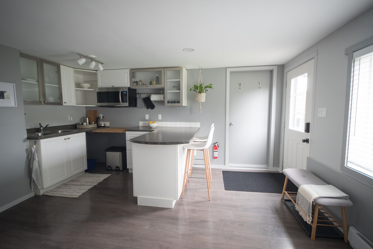 Suite privada en una casa nueva en el centro de Ucluelet, a pocos pasos de restaurantes, tiendas de comestibles, tiendas, playas y el sendero del Pacífico salvaje. La suite tiene un dormitorio con cama tamaño queen, cocina, sala de estar, baño y entrada privada/separada. Máquina de café expreso, tostadora, mininevera y placa calefactora para cocinar. Patio trasero boscoso en un barrio familiar en un tranquilo callejón sin salida. Zona exterior cubierta para colgar el traje de neopreno con manguera de lavado. Fogata de propano en el patio trasero. Operando con licencia comercial.