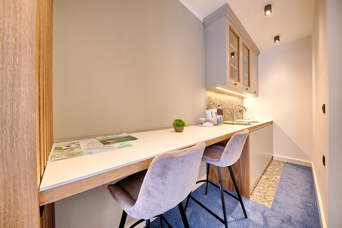 Apartamentos tipo estudio: perfectos para parejas /de un solo uso o viajeros de negocios. Galería de estudio con vistas directas al mar: relájate o cuida el trabajo en un moderno apartamento estudio. Un ambiente tranquilo y pacífico hará que tus vacaciones sean agradables. Aprovecha todos los servicios de este apartamento, como la hermosa vista del mar Adriático. • Cama: tamaño queen + sofá • Capacidad: 2 adultos + niño • Vista: vista directa al mar • Recomendado para: parejas / solteros o viajeros de negocios